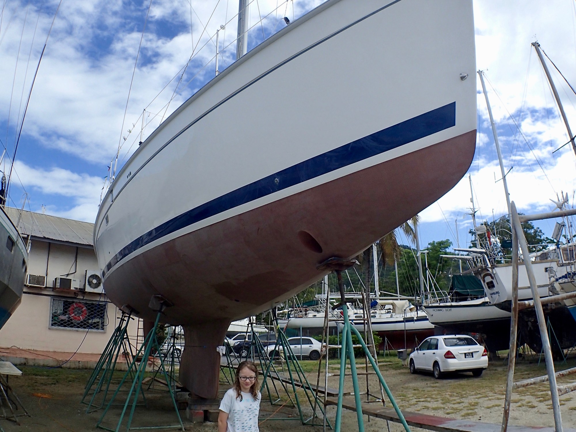 Back on Quest. Walking back into your old life. Not too bad I thought. Not too bad at all. Ok.. three metres up in Chaguaramas boatyard in Trinidad, we still haven’t gone anywhere yet. But in the meantime; 25 towels, two different kinds of Monopoly onboard, a Barbie camper van and five Harry Potter colouring books, it’s been the moment for us to de-clutter. While filling bags to give away this week, it was also hard to forget that when I was last on this boat, I was gluing myself to the floorboards. We’d never left her before. Then, after two weeks of getting her hauled out and shut down, Jack and I climbed down her boatyard ladder and, for the next eight months in the UK, I didn’t think about her once. Only to imagine her like she was a dream.