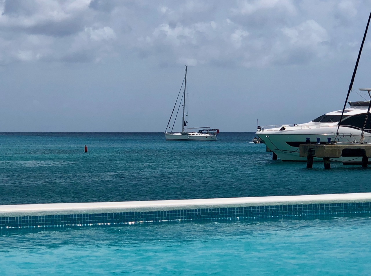 Meanwhile, we pulled in very Quest’s dug-in anchor and came back to the north yesterday to check out at Customs and Immigration. We’d started up here at the Port St. Charles Yacht Club, arriving just over two months ago. Boy, this is a posh place. I’d forgotten how quiet it is. Civilised-feeling. Even the beaches are soft and silky. This place is just about the opposite of where we’d been staying in Carlisle Bay. You can swim right off your boat into coral reef. I’d made breakfast as usual this morning, but then unusually right after I went for a swim. Just under Quest, a school of Caribbean reef squid hung in the water, ruffling their skirts. I exhaled through my mask. This was nice. A little further on, a school of blue chromis fish came through the small, brown coral heads like kids heading down the school hallway. Trumpet fish swam with them. Different species swimming together, I noted. Was it strange that they all hung out together? With all this space on the reef?