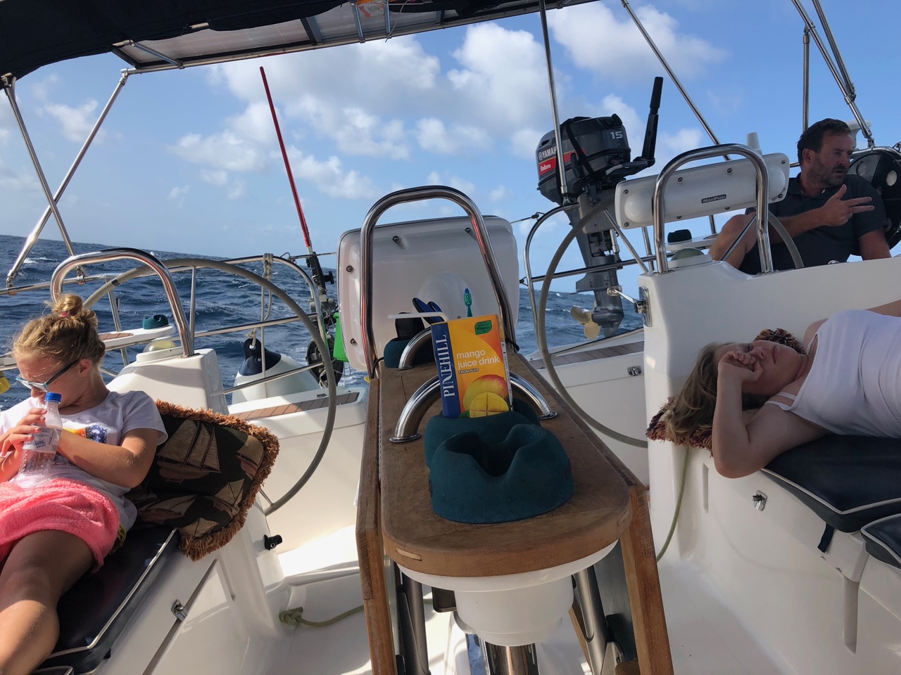 Oh well. Back to Questie. Floating, white attention seeker. After the fish left us with all our 1km of line and an exploded reel (still, thank goodness we didn’t have to land this fishy goliath) the sea became a rolling bed of three metres. Quest went quiet then. The wind powered her like silent fuel. We got the harnesses out and clipped the girls to the A-frame. They didn’t even moan too much about it. The waves were coming at our beam side. Quest was happily spitting them out. For lunch, I filled pot noodles with boiling water and placed them in the sink for protection while they cooked. For me, this is the measure of how rough conditions are. When we started sailing, we were helped to get the hang of Quest by a guy called a super guy called Ian. No longer with us. He gave me advice about cooking while underway, including using the sink for hot liquids. He told me that once, when he was on a rough passage on another sailing boat, he’d asked an inexperienced crew member to make tea in the sink. Ian checked up on him a little while later and saw that, rather than cups in the sink filled with tea, there was a sink full of light brown liquid. Oh yeah! It was a sink full of tea!