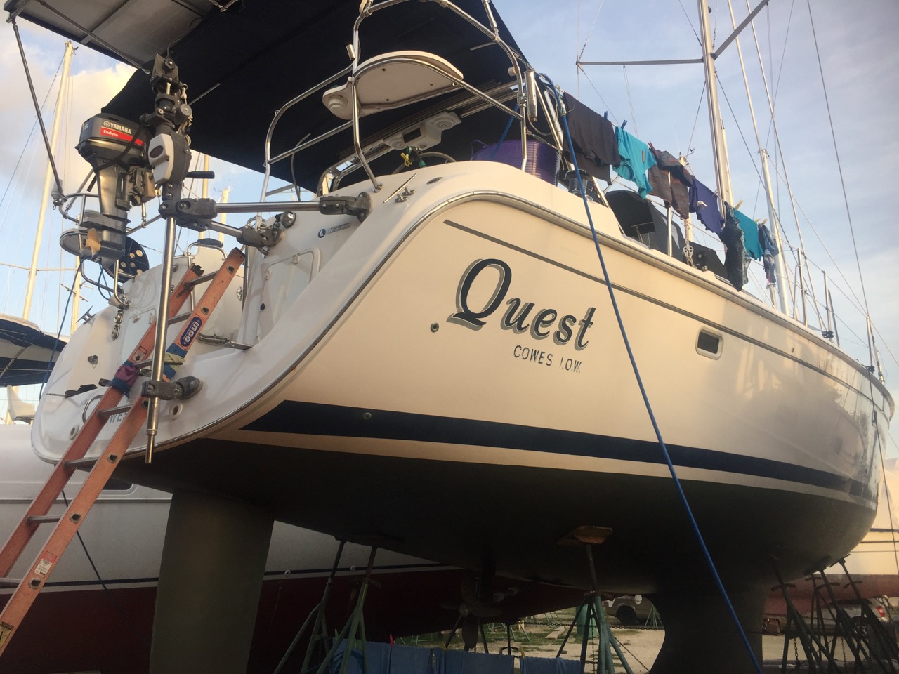 But not all is perfectly well in the boatyard. Falco the mechanic arrived from the adjoining boat yard to shut down Quest’s engine; changing the oil and running coolant through the system to stop any corrosion. One of his team is missing.