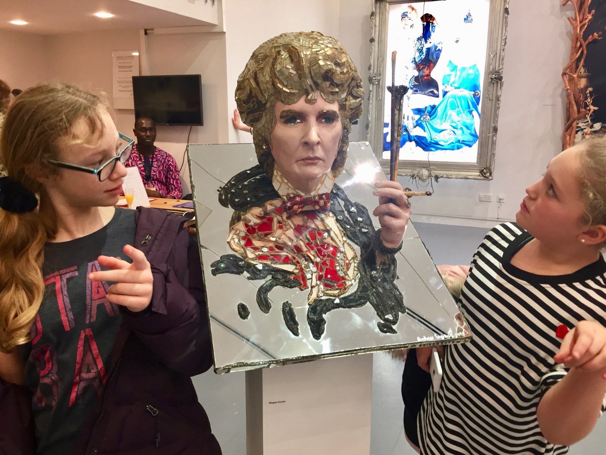 So, the art group’s next trip is on the train next week to another small town nearby; Newtown. They’re visiting a gallery and having Christmas dinner. I don’t know why the travel? Just for fun I guess… In the meantime, a new exhibition has opened at the Aberystwyth Arts Centre. It’s by a sculptor called Andrew Logan. If you read his online bio, it starts by saying that Andrew Logan belongs to a unique school of English eccentrics. Hmmm I thought. Not quite rural Wales. Then Rachael from the Arts Centre called up and said if we wanted free tickets, we could have them for the opening event.