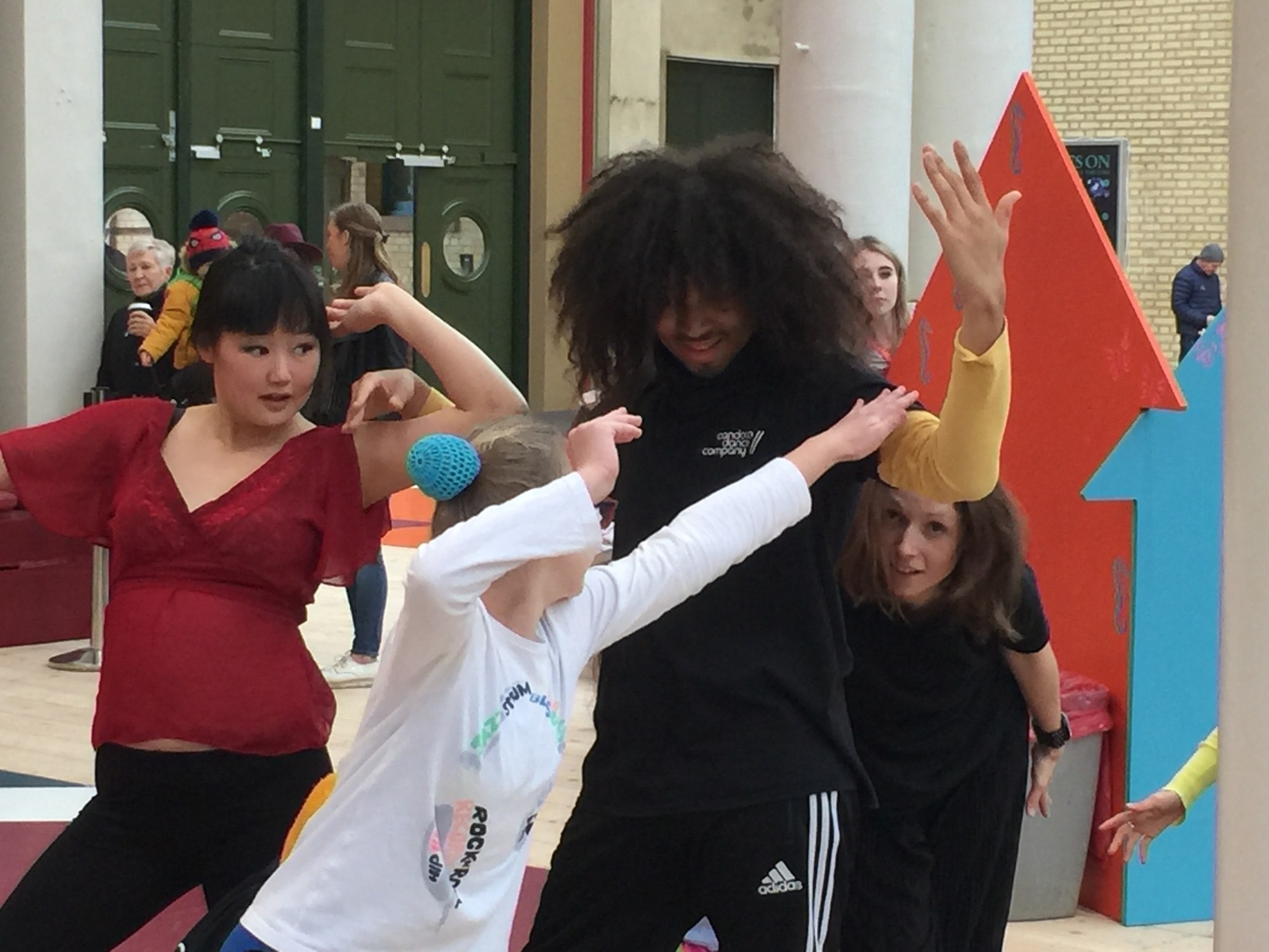 Back to Candoco’s workshop. There was a teenage boy in a wheelchair who’d never been before. His father stayed close and watched him the whole time. A grinning lady had a speaker tied to her wheelchair. She played music throughout. A dance teacher with one full-length arm was doing push-ups on both arms before the workshop began. A skateboarder-type in a yellow beanie was up on his toes. When the workshop began, he wanted to dance with Delphine but she refused. Delph gravitated to an Asian lady instead with a floaty red top on and a lovely smile. ‘I came today because I saw Candoco on Strictly,’ she told Delphine. ‘I’m disabled too.’ Delph nodded back sagely for her eleven years.