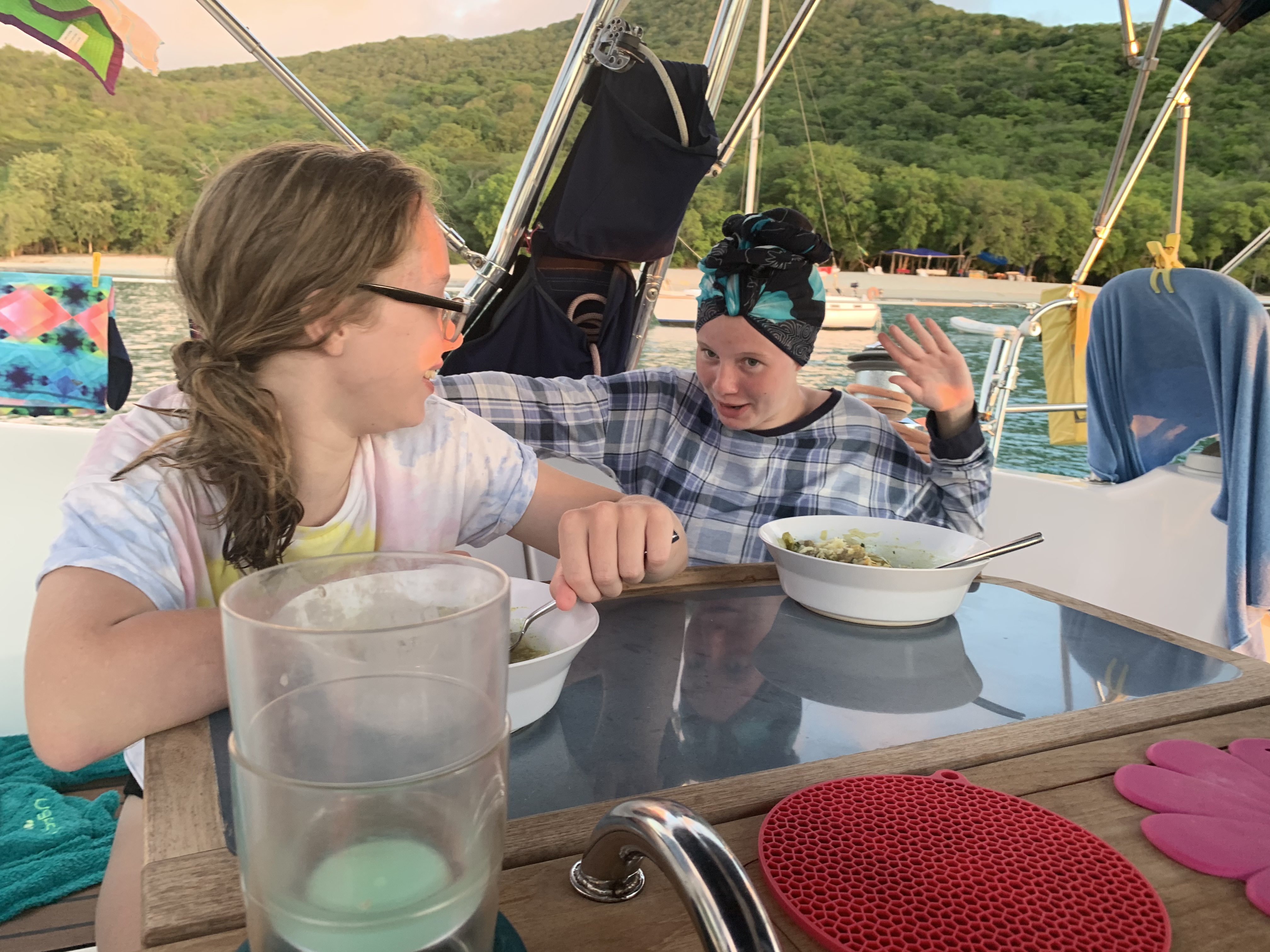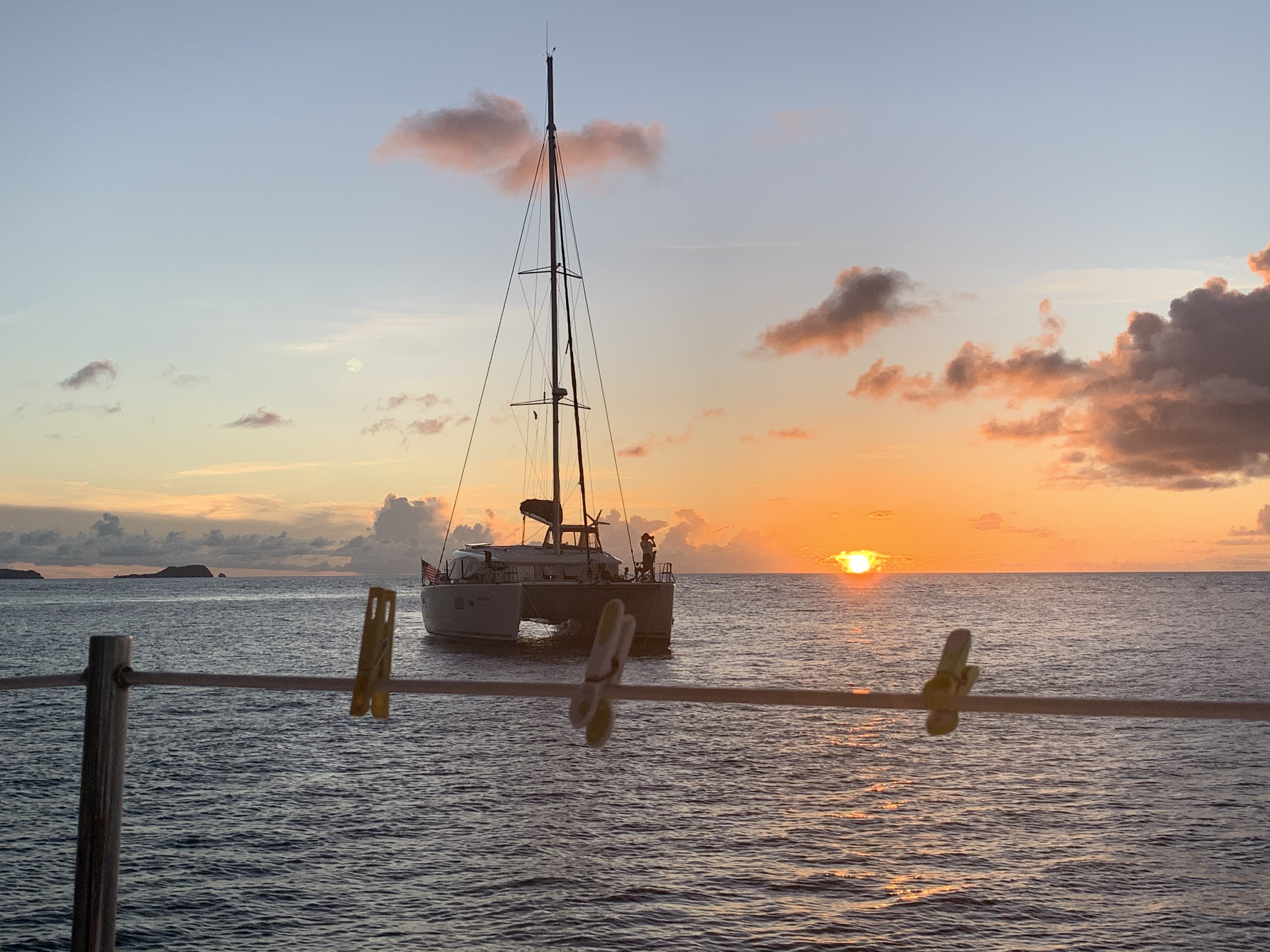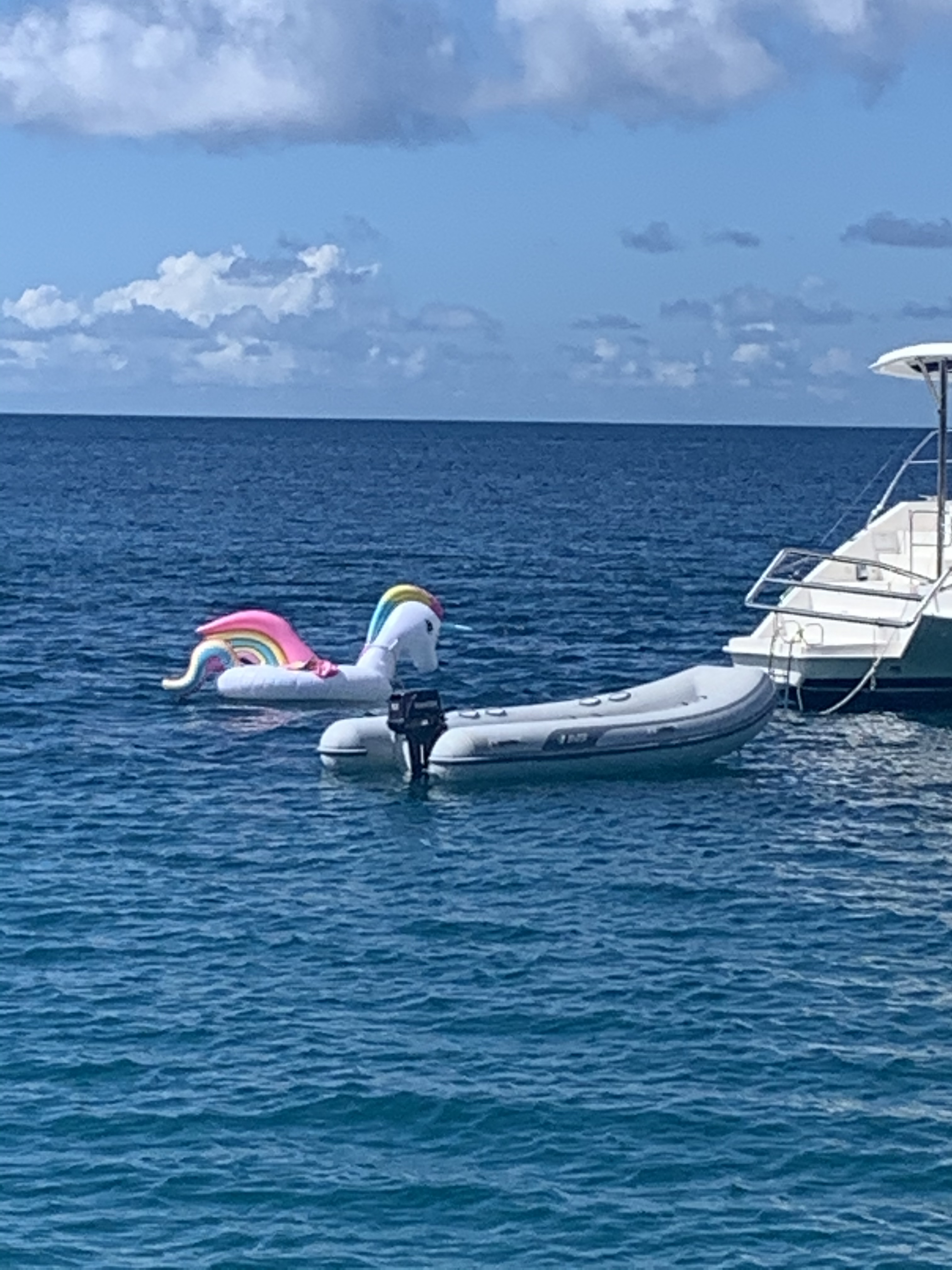 We dropped the anchor between the beach and an American charter catamaran. Eight people were on the charter boat. And a large blow-up unicorn. Two other catamarans in the little bay were regular cruisers. Quiet, hiding types. The charter boat was there to party – and there’s nothing wrong with that. We are enjoying listening to the turned up American voice. Makes eavesdropping much less of a headache.