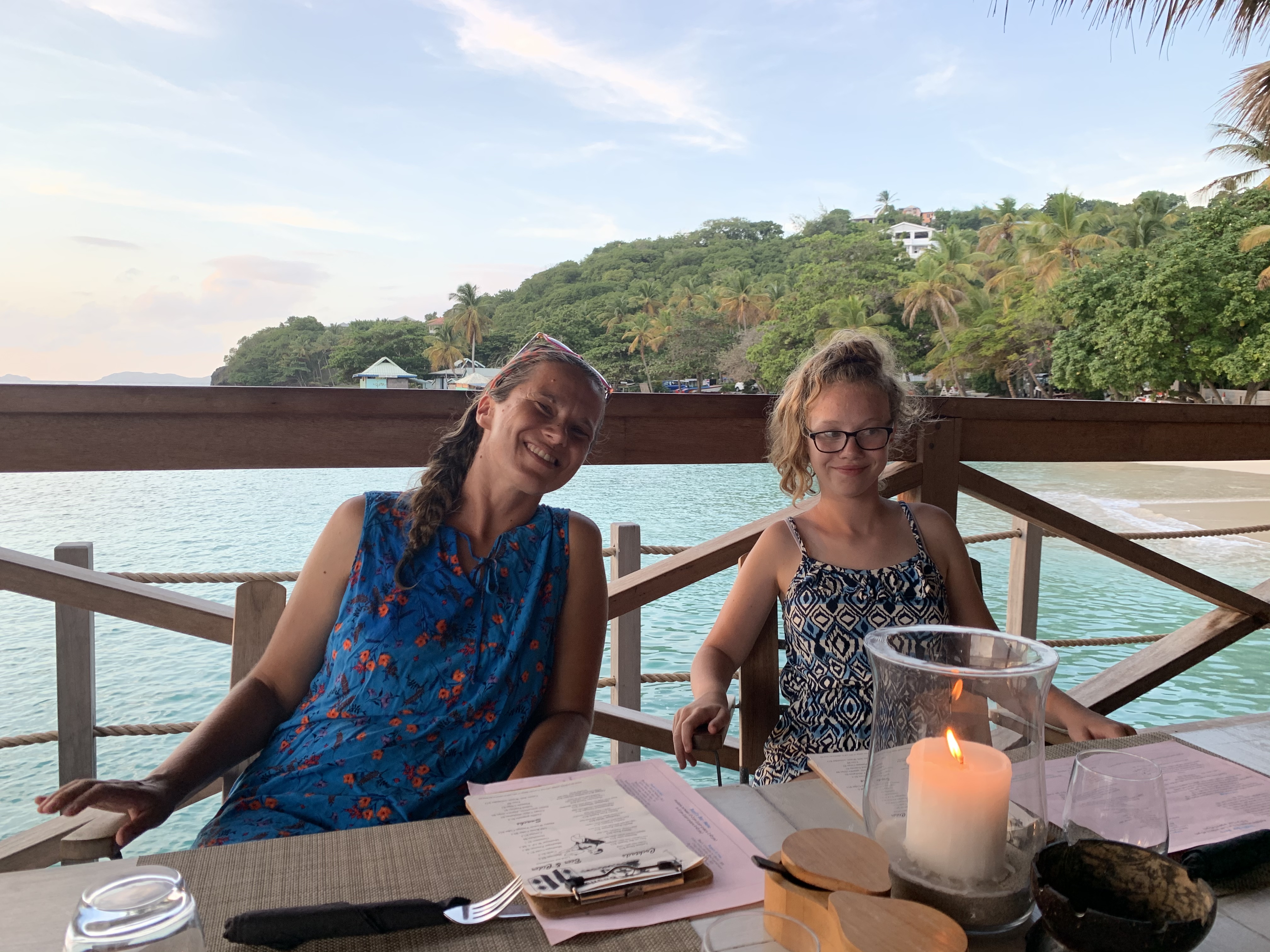 Lu had her Trini T-shirt and her new head-wrap on. I bought the wrap for her in Grenada after she told me she liked Lola’s at Eden Sushi. She’s discovered the excellent way head wraps hides salty hair. I think too she’s enjoying feeling the Caribbean wrapped through her locks.
