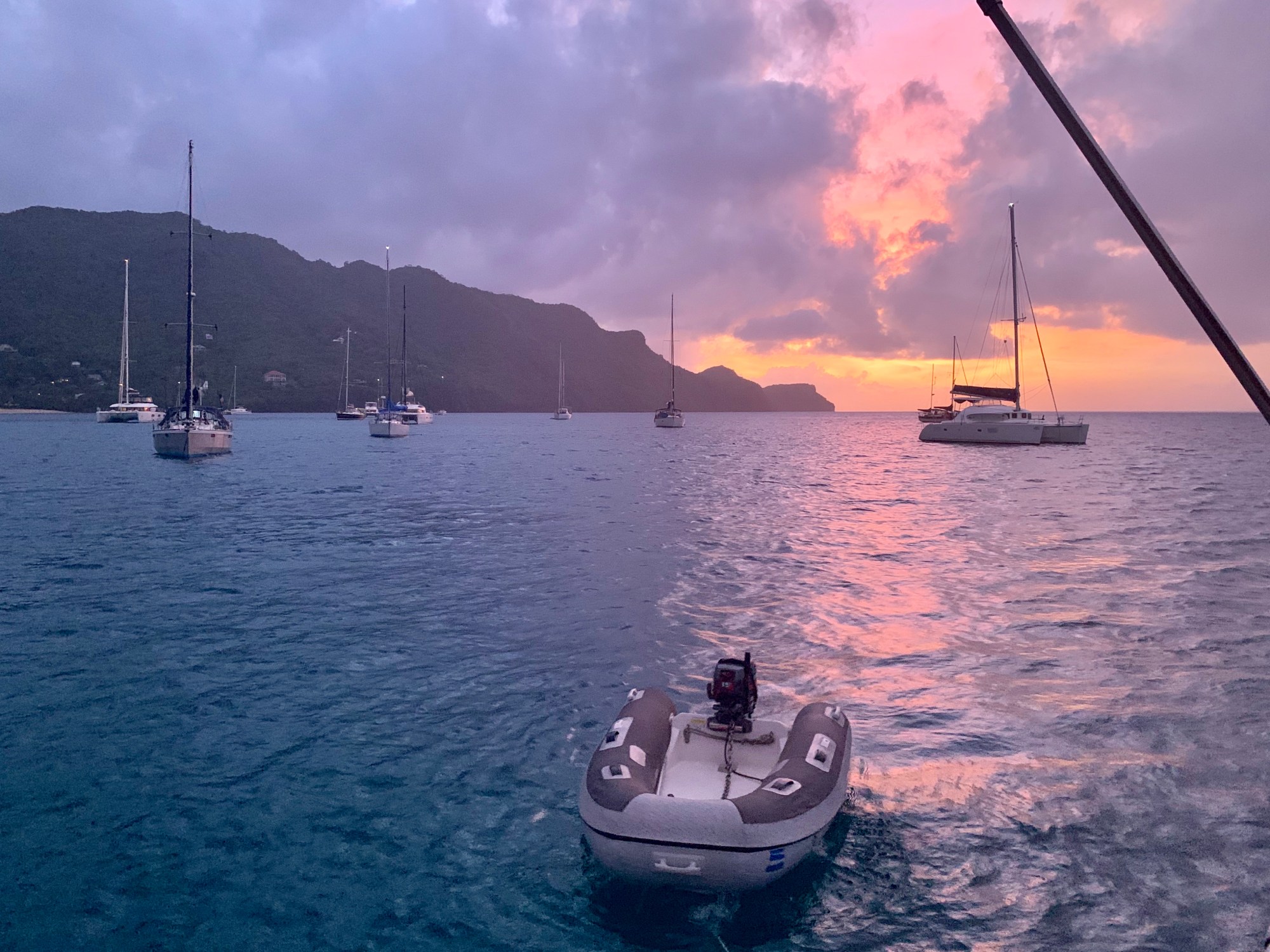 Jack calls down from below, ‘Shall we lift the dinghy?’ We lift Edna every night for security. Unfortunately, dinghy and outboard engine walkabout is the biggest theft risk for cruisers here.