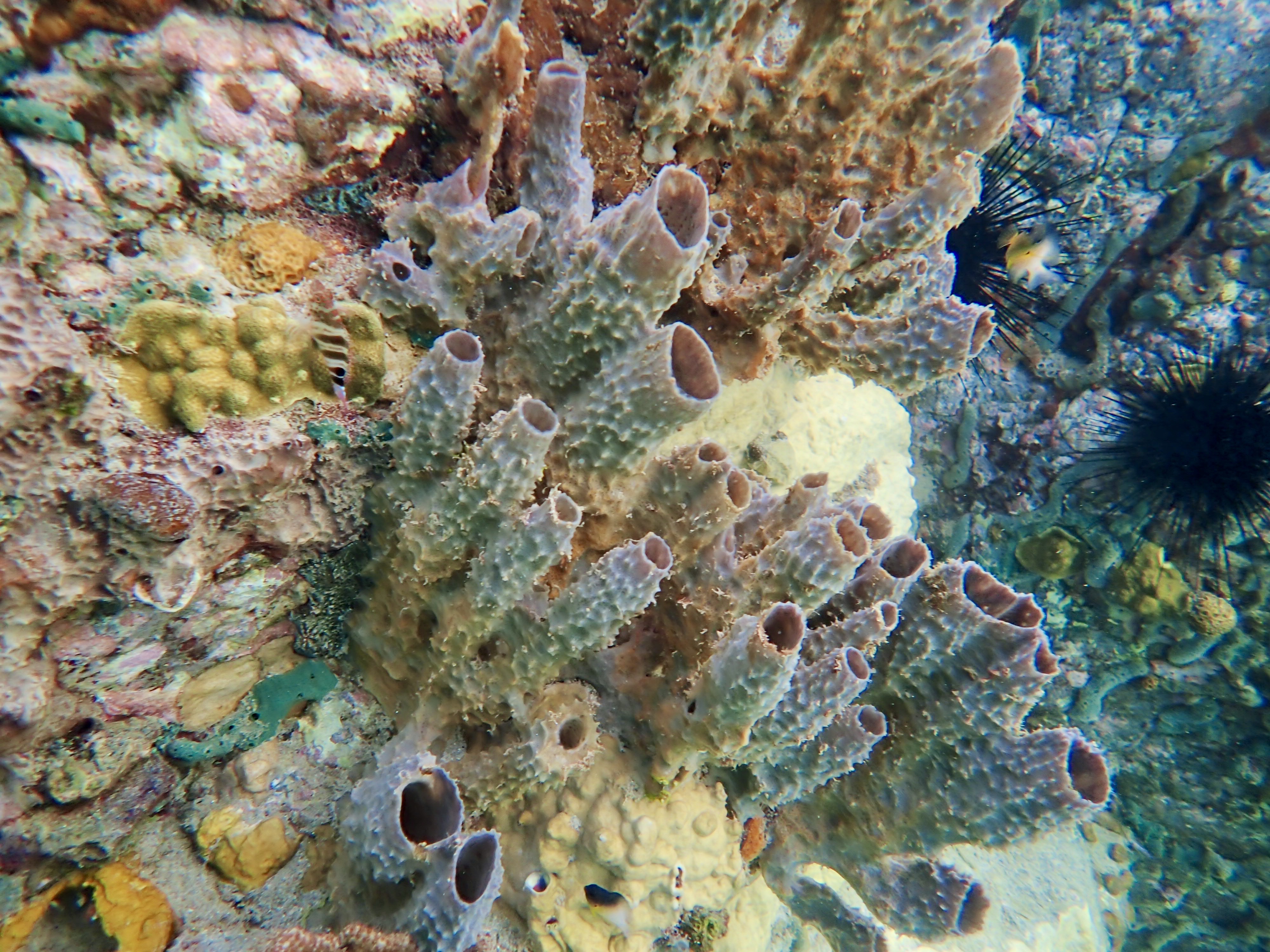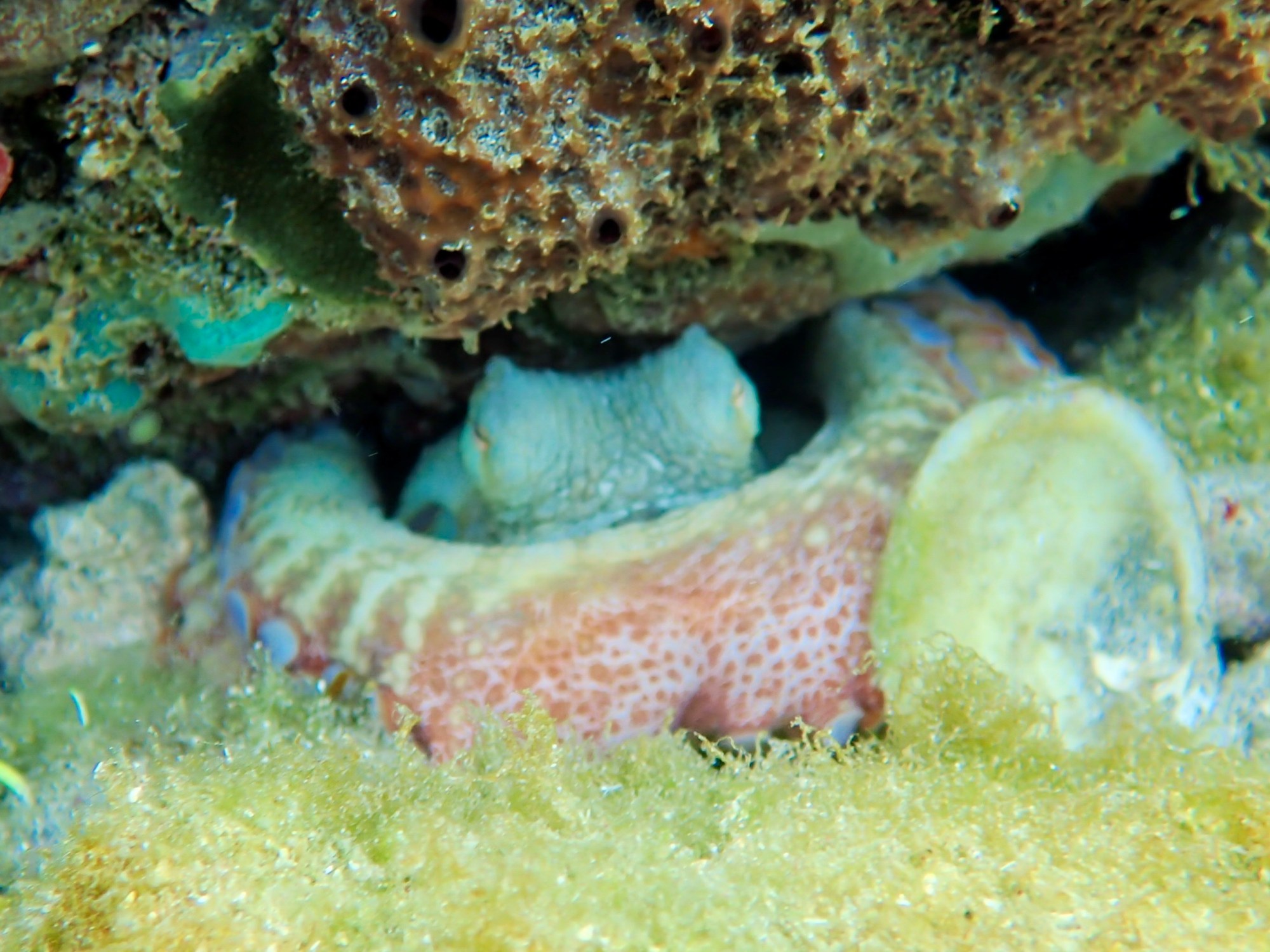 What you get instead here are crazy orange sponges, outcrops of corals that look like scattered giant brains… and critters. Jack quickly spotted the local octopus hiding in its homey hole. It was surrounded by pink sea shells. Not sure if these were the octopus’s last meals or deliberate attempts to make a pretty home. The octopus was in too and hiding behind his tentacle. Only the eyes poked out.