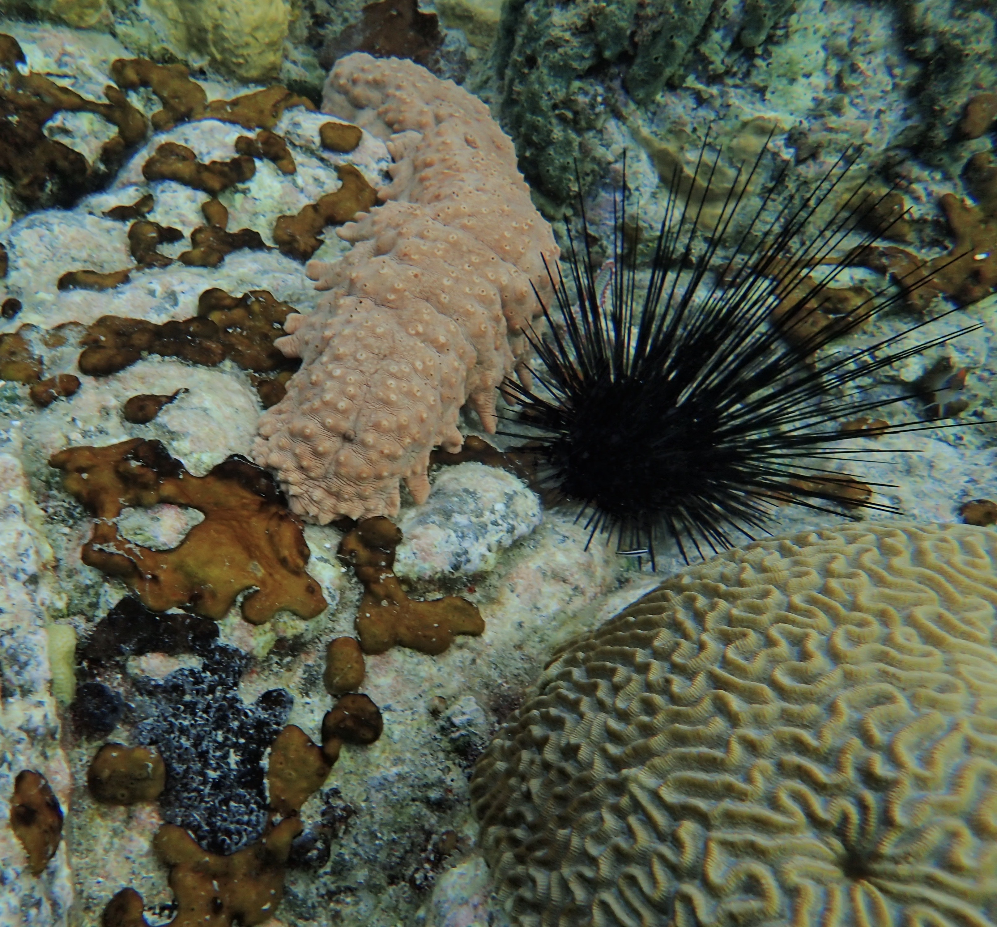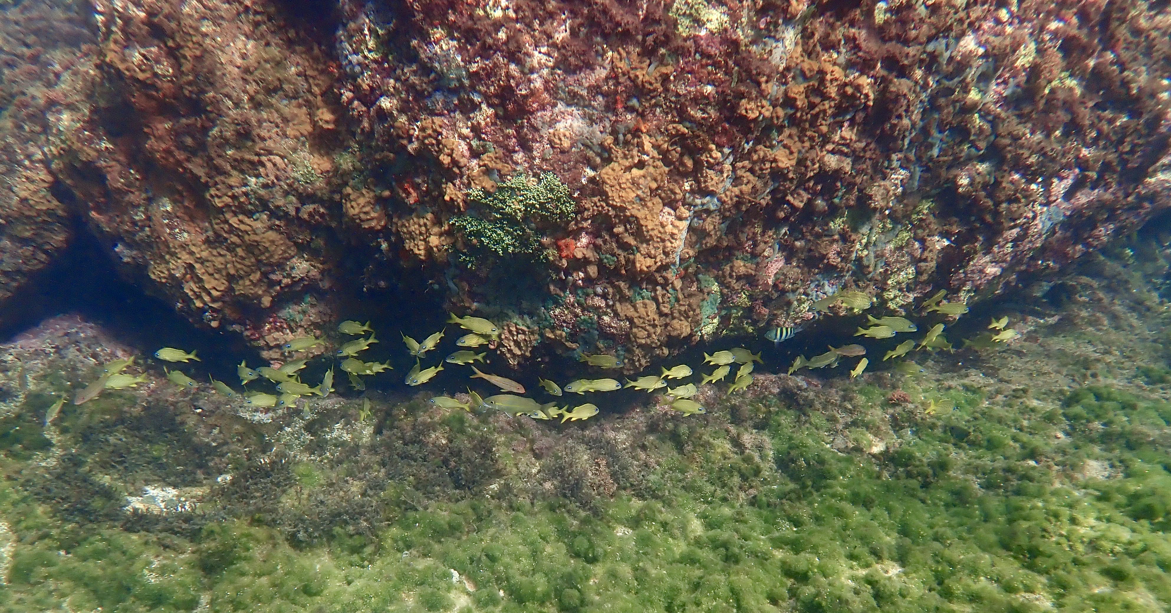 All this rain and still there’s excellent visibility. It isn’t so much coral beds like it is in Mustique – as it is rocks. You swim through expecting cold-water kelp fronds and nudibranchs – as though you’re swimming through typical, rocky underwater ecosystems back in the U.K.