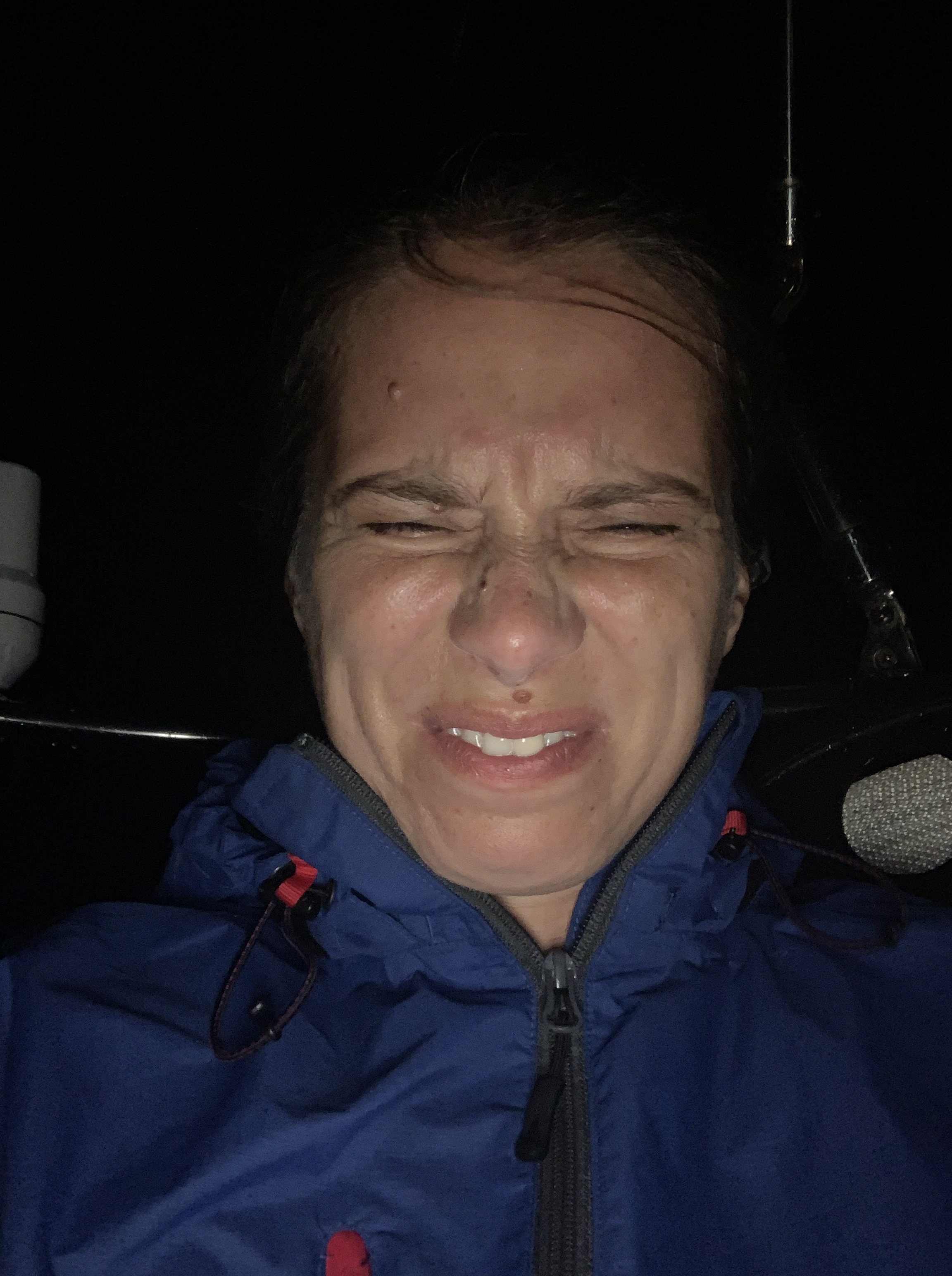 For the next, I found our oilies. We just managed to slip them on. We’d put away our headsail too which was a good call – the wind instantly accelerated from 17 to 35 knots. We’d caught the very sting of the squall’s tail.