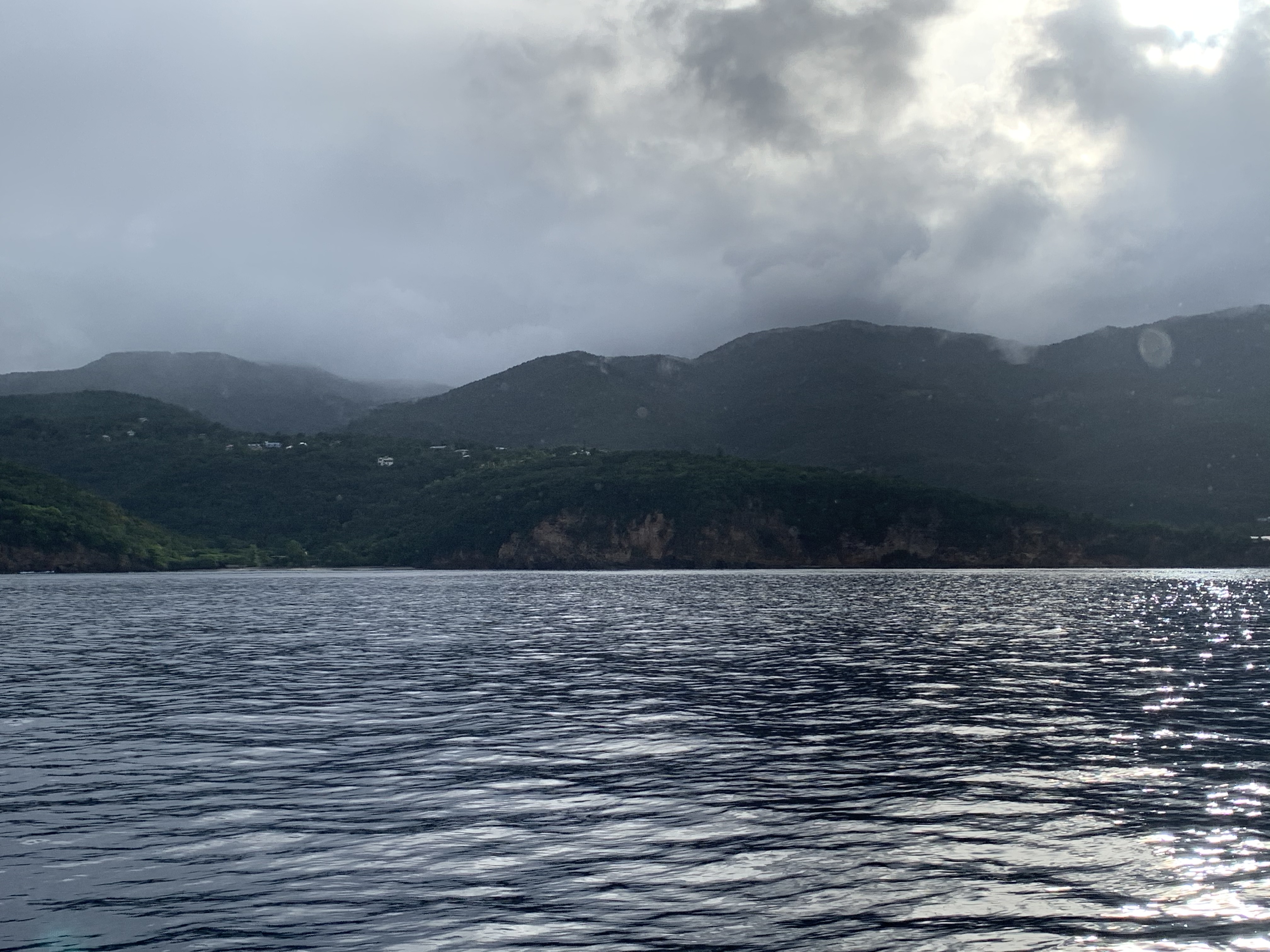 Our first was in the Dominica Channel. The cloud drops to the water. The sea changes from indigo to graphite. The last thing is the rain hitting on the sea – the surface goes glossy, misty even. Then, bang. The first one, we were still in our shorts and t-shirts. Nice outdoor shower.