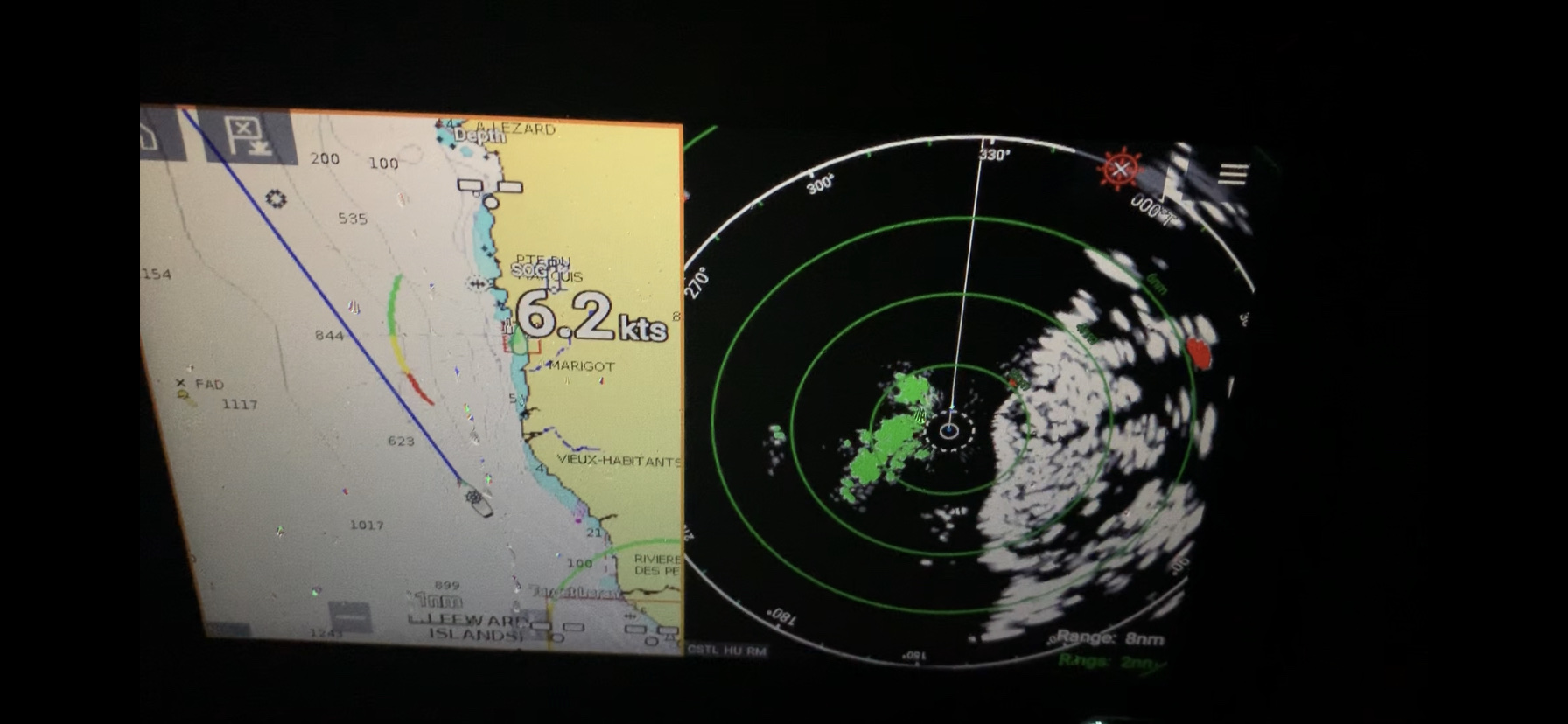 The French islands are covered in lobster pots. Where it’s shallow – it’s pots. We had the engine on to negotiate both squall and the lee calm of Guadeloupe. The wind and rain was just easing… when I saw the last pot. It’s tiny yellow buoy pointed like a wasp.