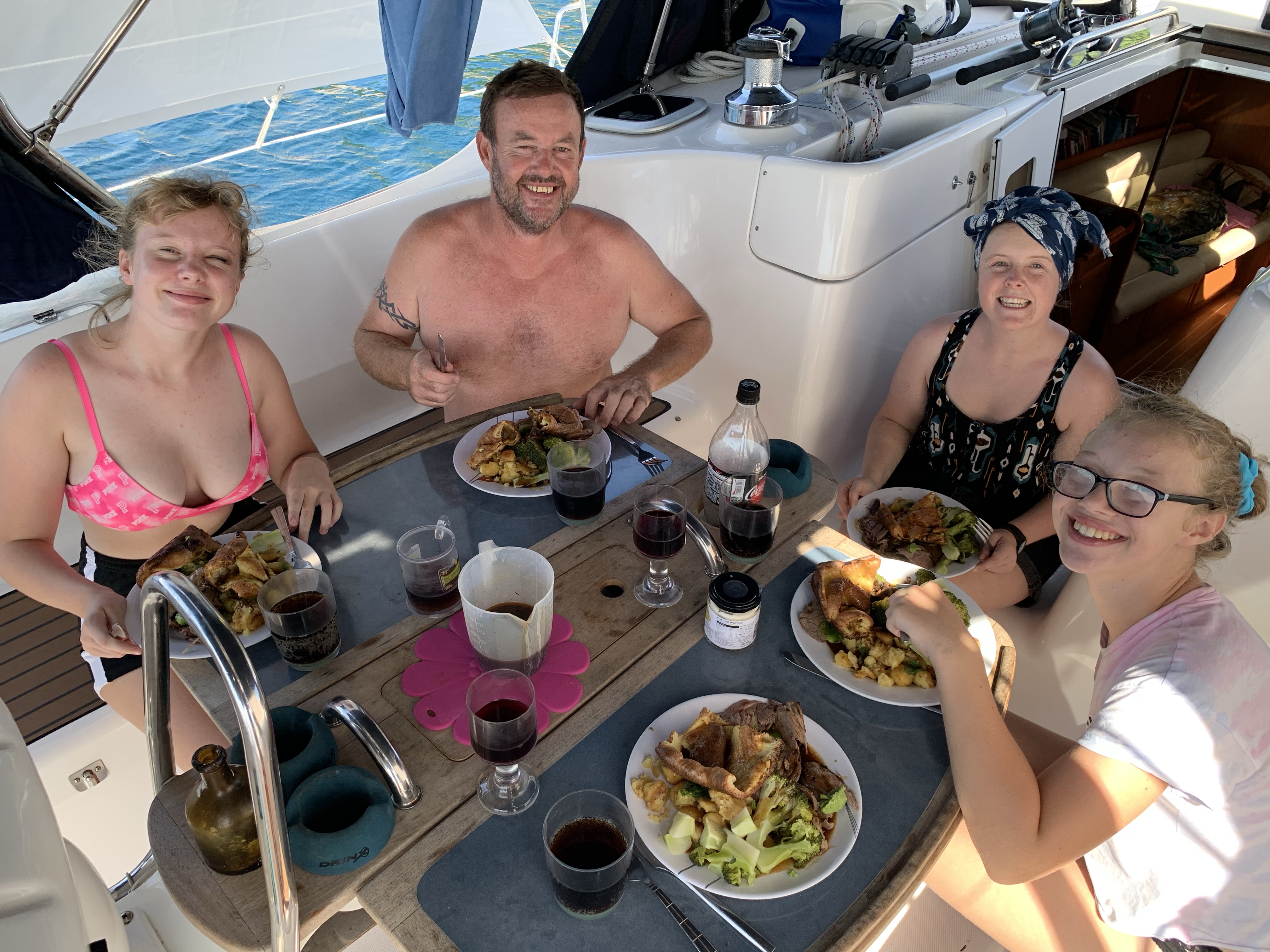 It was the first roast dinner we’ve had since we arrived on Quest – and probably the last for a while. Not that we can’t roast in our gas oven – but doing it today felt like a treat. Treats are by nature, not every week. Tomorrow we’ll go back to the one-pot wonder and feel like sailors again. Maybe cook some omelettes. Ham? Cheese? Mushrooms anyone?