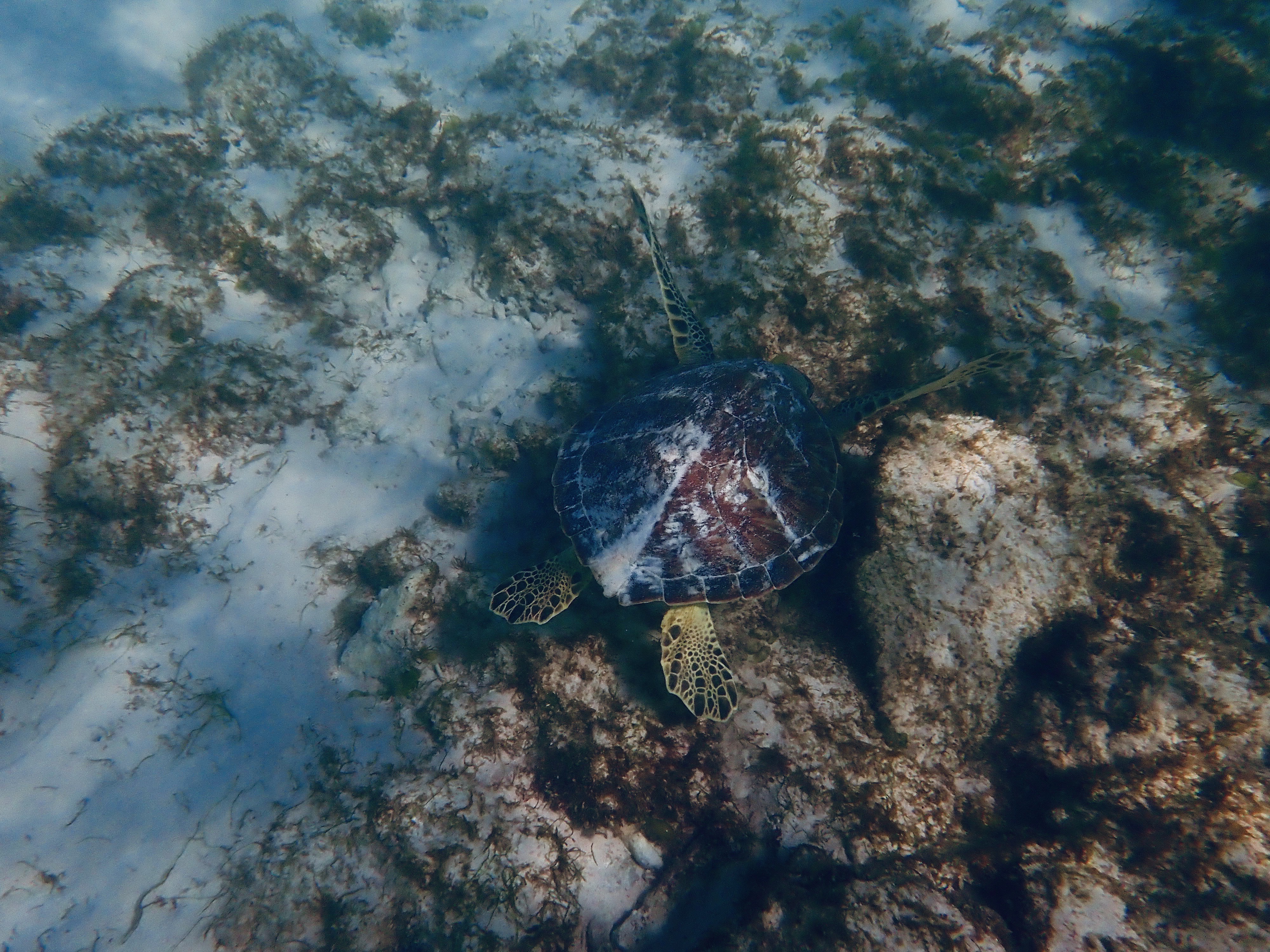 Me: Good question. It’s complicated. What kind of turtle are you? You look like a hawksbill turtle. You have a beautiful, iridescent shell and a bit of a pointed beak – but you’re small, so I’m wondering if you could actually be a juvenile green turtle? There’s another one a few metres away. That turtle definitely seems like a green turtle.