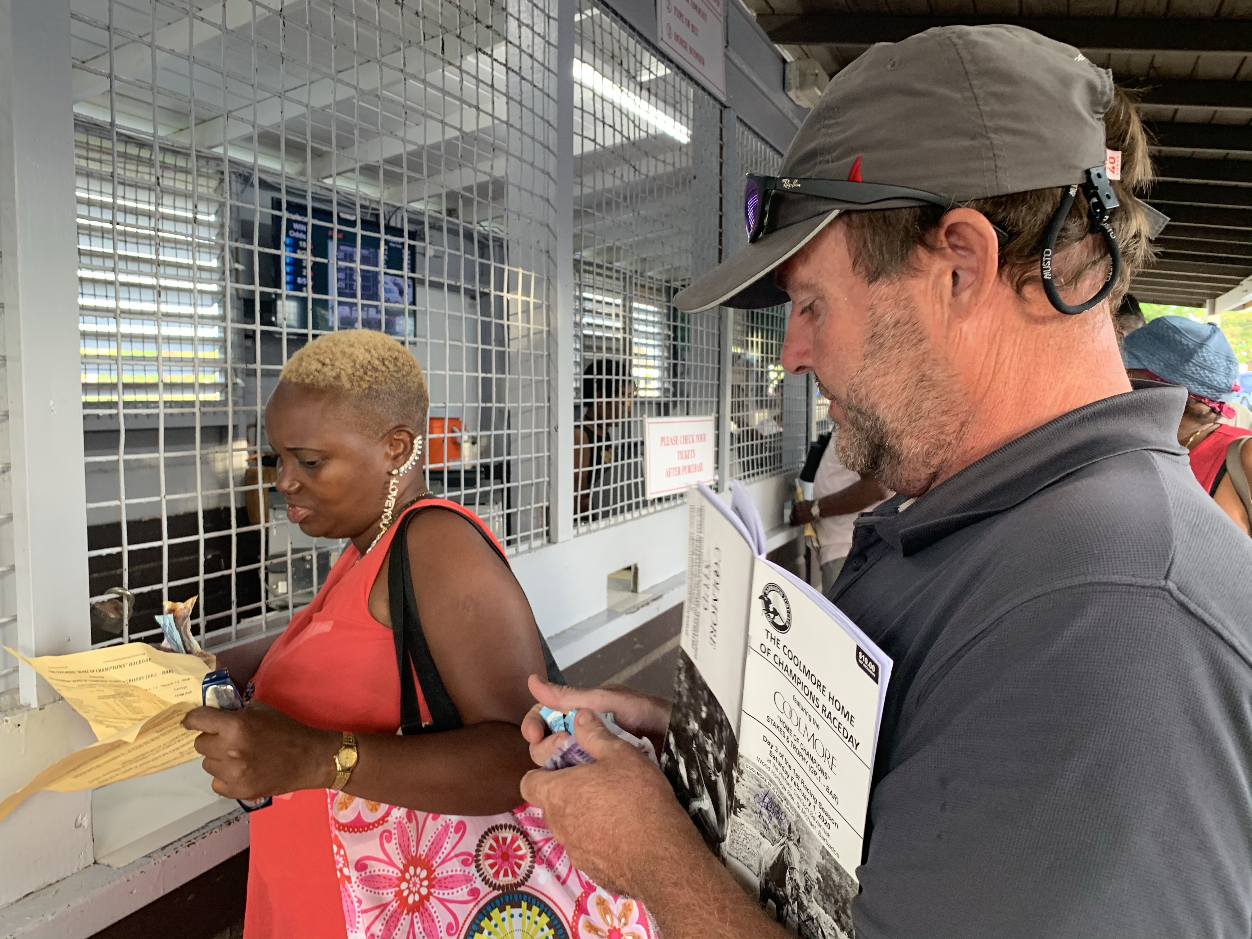 We rounded the corner and came up along the historic military district, The Garrison. Only to be faced with Bridgetown’s Saturday horse racing. Result! We veered Shareef’s car into the car park just by the track. Despite the crowds, there was still room to park. We checked the timetable. 5:15pm – the main race was due to start. Just over ten minutes away.