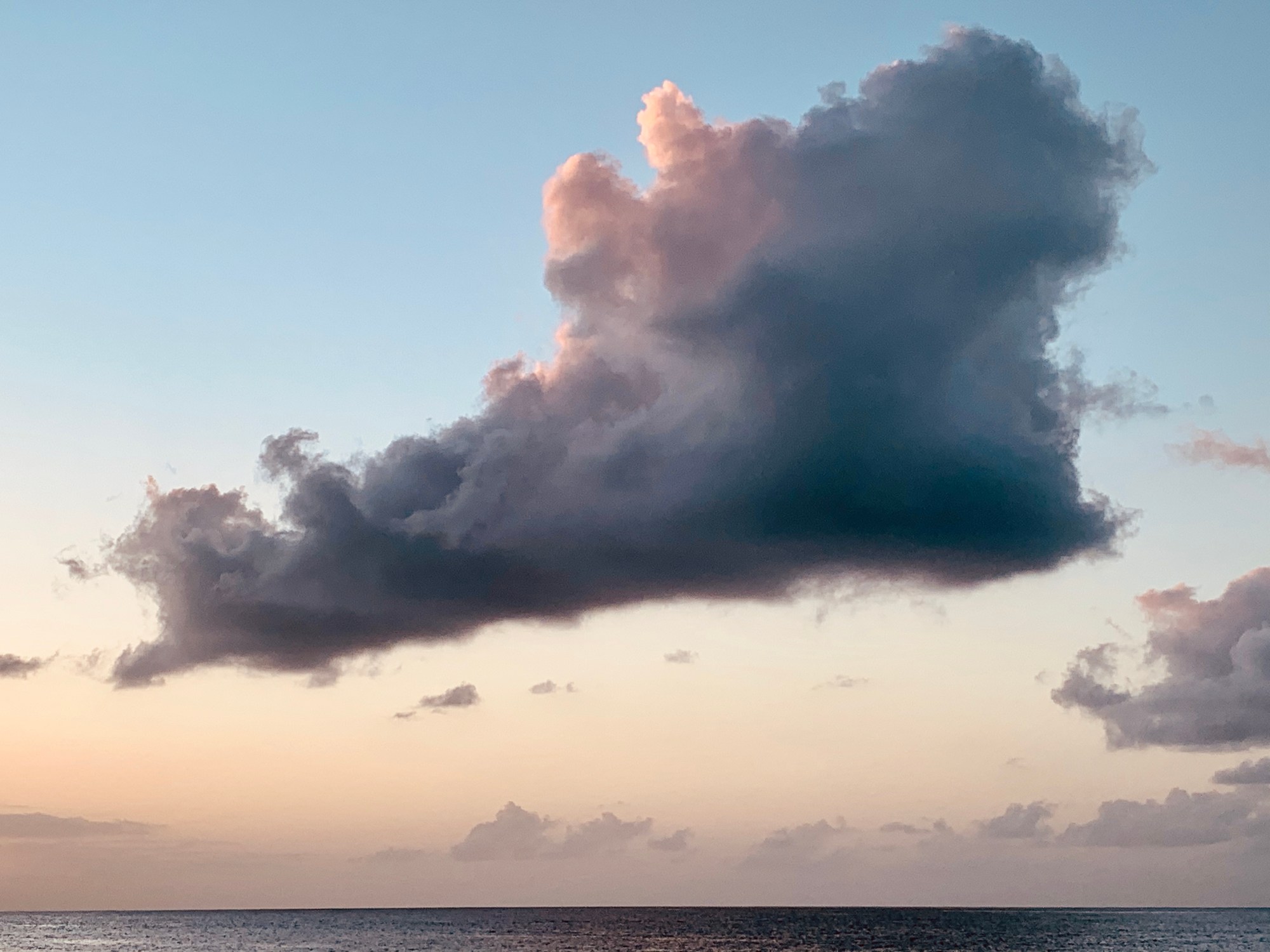 I need to lay my conditioning down. I don’t want to cook dinner, clean up, do school or look after anyone tonight. I want to lie here and feel Questie sway gently on her anchor. I’m watching at the clouds passing by. It’s late in the afternoon. The clouds are slowly turning pink.
