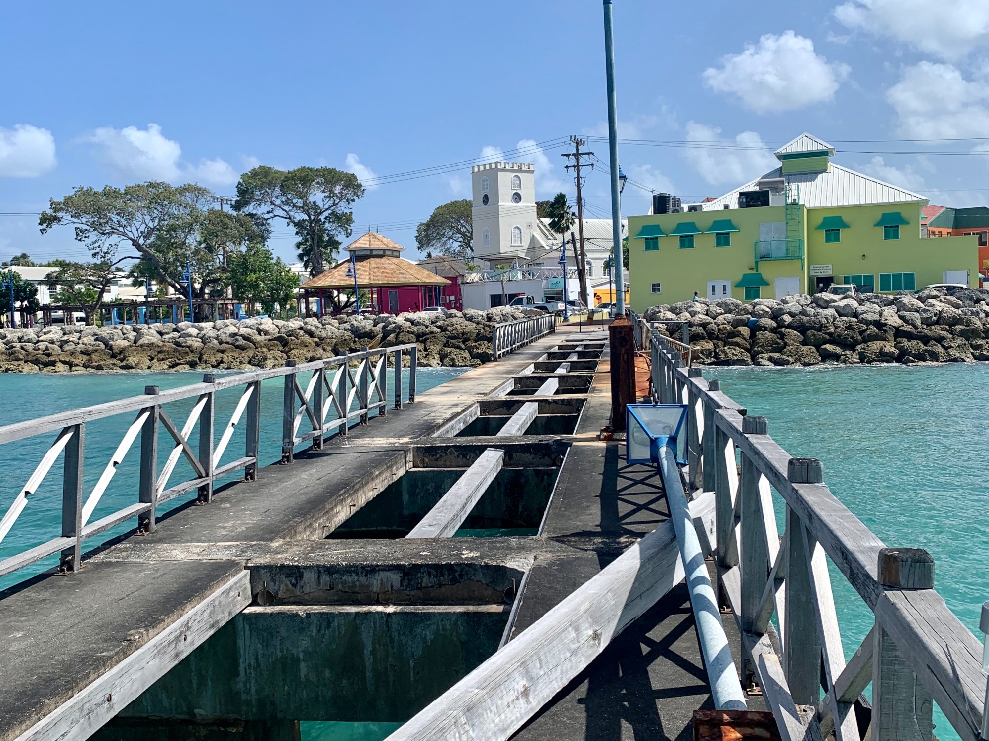Instead, we go by dinghy. No big deal, right? Except the pier to tie up to in Speightstown is closed down. It seems it’s been hit by one too many waves. Parts of the pier are hanging off and missing. There’s a fence that’s been added to the entrance from the promenade with a lock tying it together, so no one goes in. It’s a sensible thing too, since parts of the pier’s floor is missing. You have to walk carefully on the concrete edges not to fall in. The wooden railings on the sides are either loose or missing. Then, either side of the entrance, are big, brown boulders. The sea growls here – even the soft, warm Caribbean spits and heaves waves onto the pier. This is where we have to tie up.