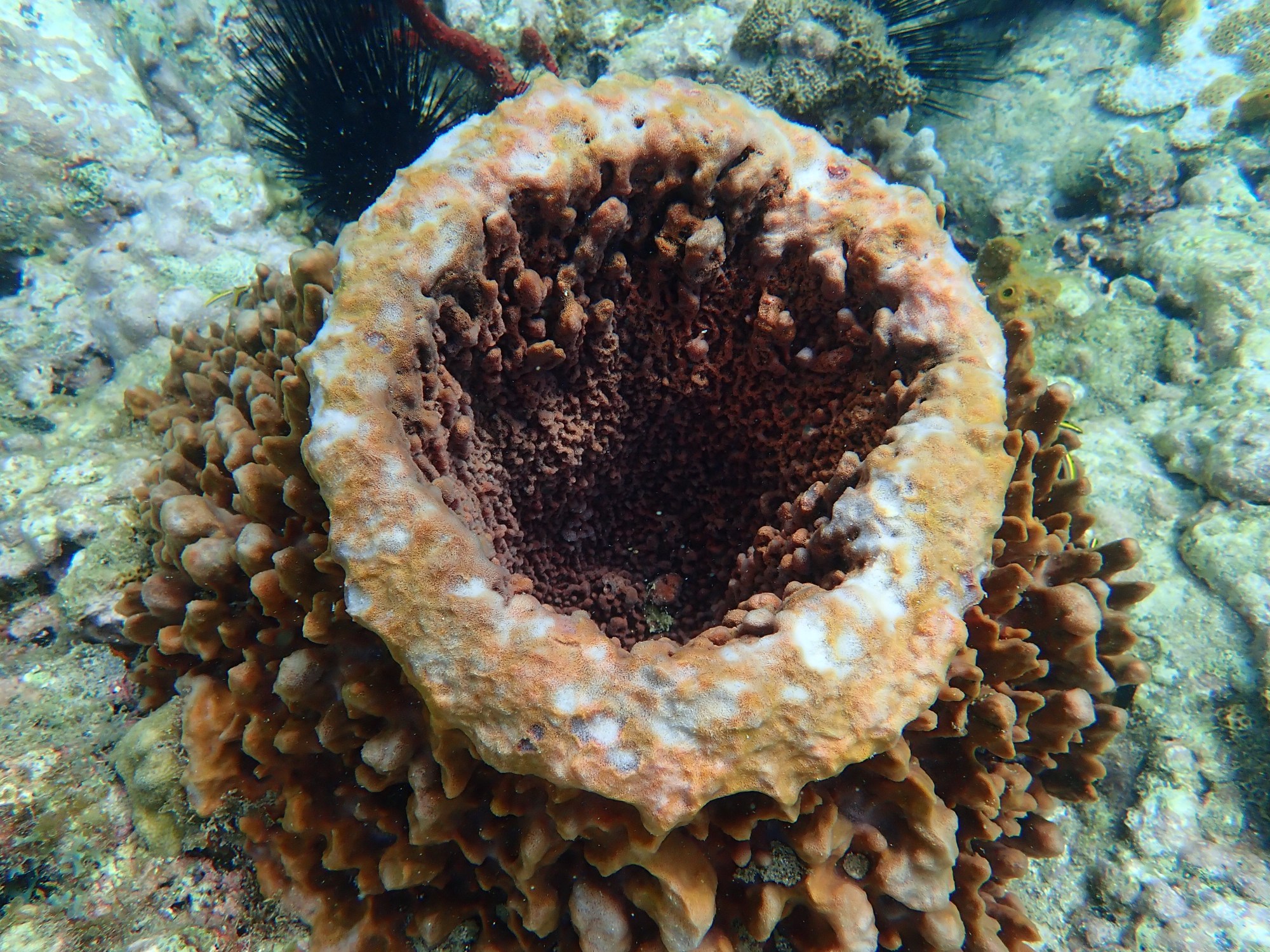Some are large and wrinkly and shaped like barrels. I like to swim over these barrels and stare into their innards. Sometimes you can see small, spidery-looking creatures. Like a tiny crab with the thinnest legs you could imagine. They live in these sponges. Surely nothing else would live in them – the inside of these sponges like the inside of Jabba the Hut’s mouth.