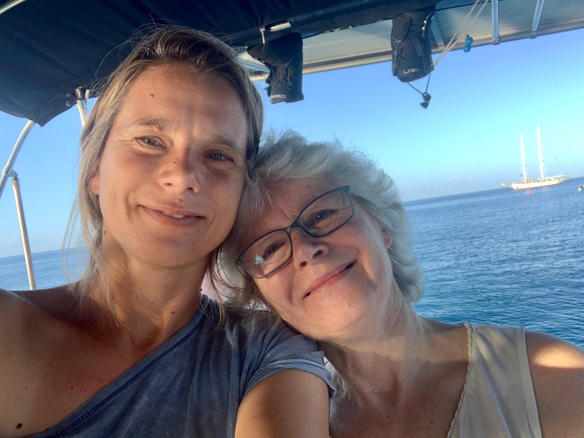 On this fine morning, Alicia is sitting on the raised helm seat at the back of the cockpit, her face pointed into the sunshine. She climbed over the dive gear to get there.