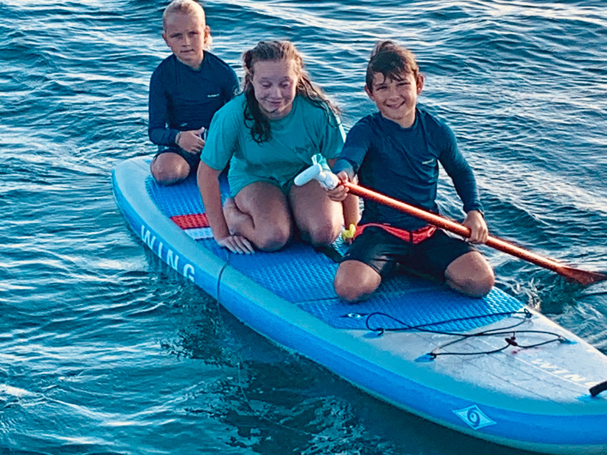 Delph wasn’t sure. Like ‘I don’t want to go!’ sure. Then Henri and Charlie picked her up on the paddle board. Delph went silent but she slipped on her sun rashie and the three of them went into shore.