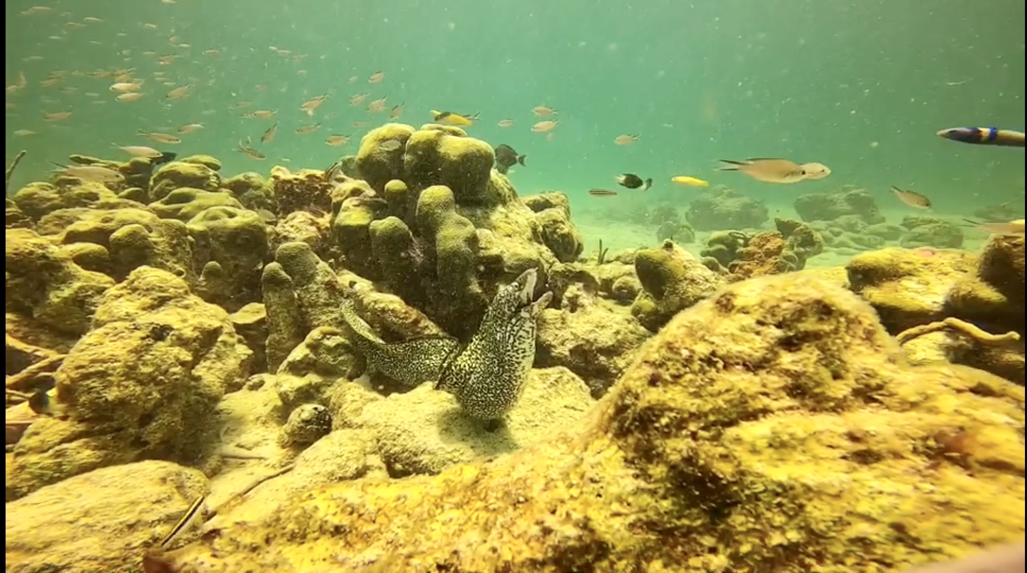 The big ones are large enough to swallow them, though they clearly needs some digestion afterwards. There’s a big bump in their bodies. Some have to lie down for a while. One moray came straight out of its hole and swam around us the other day after swallowing its meal. The eel was beautiful, undulating its long body under a proud blue mohawk. Saying that – it was unnerving. The green water added to the strange effect.