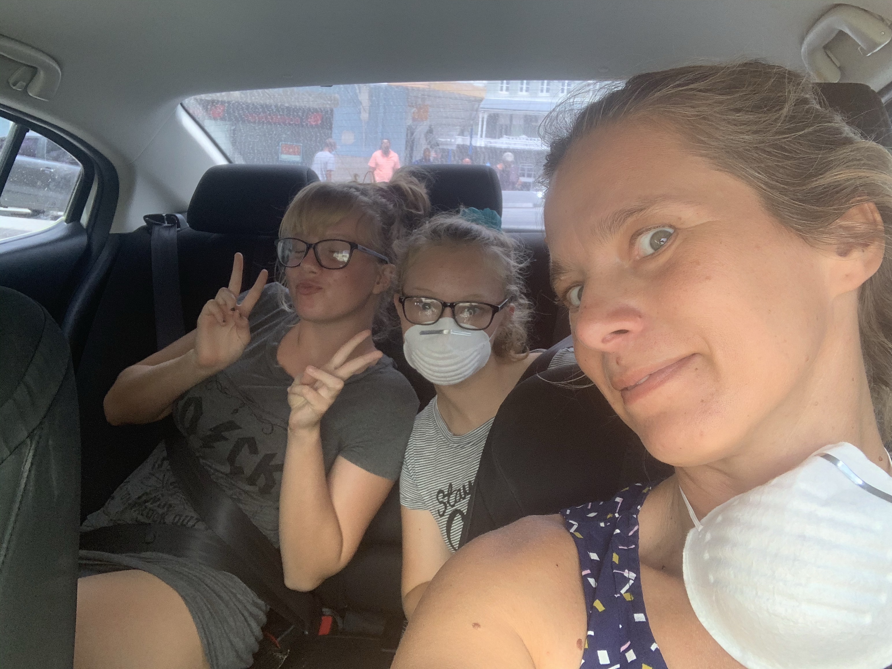 Those guys have decisions to make. In their typical generous spirit though, they shooed us out the door. We put masks on and started up their car engine. Woohoo!