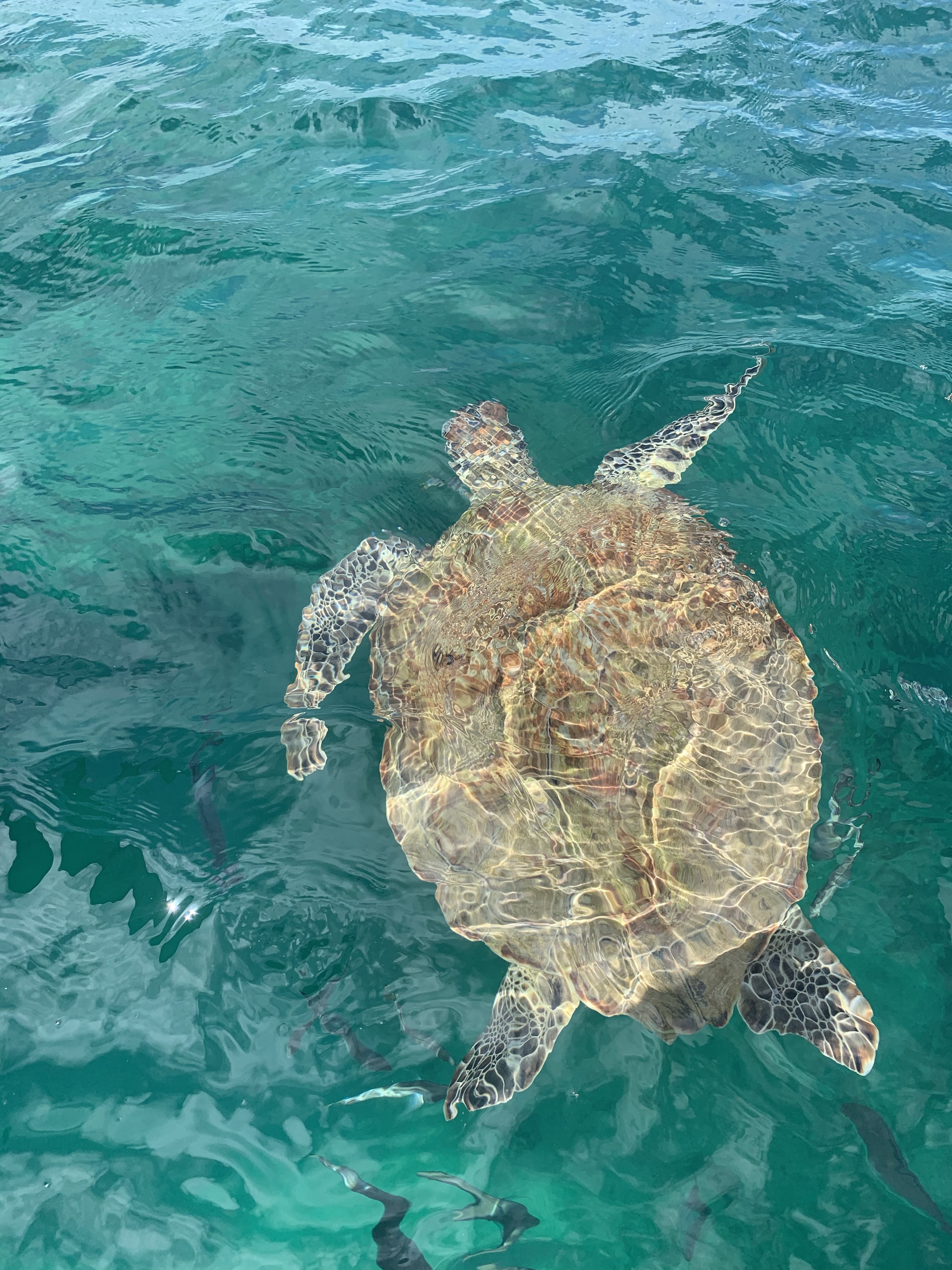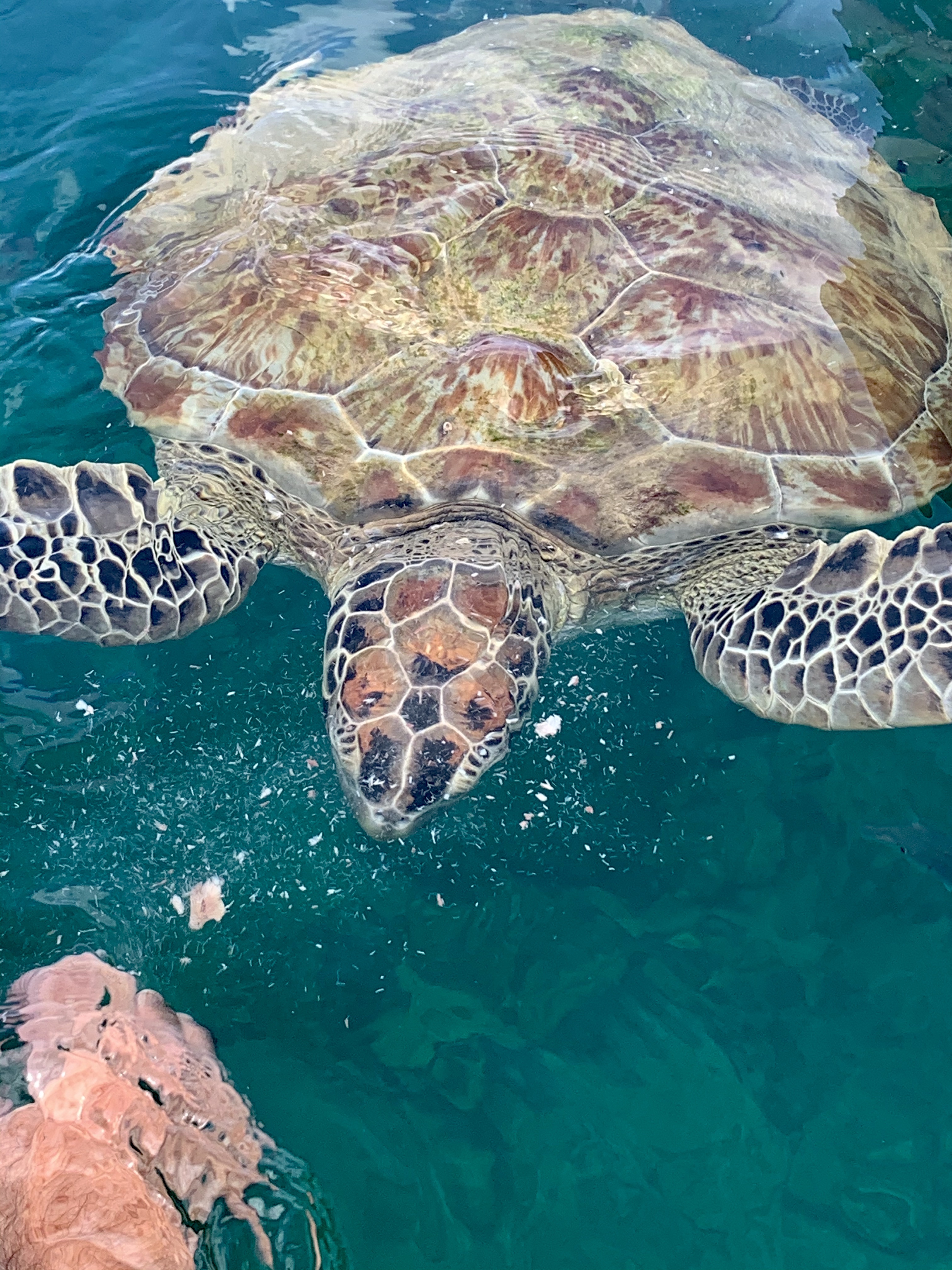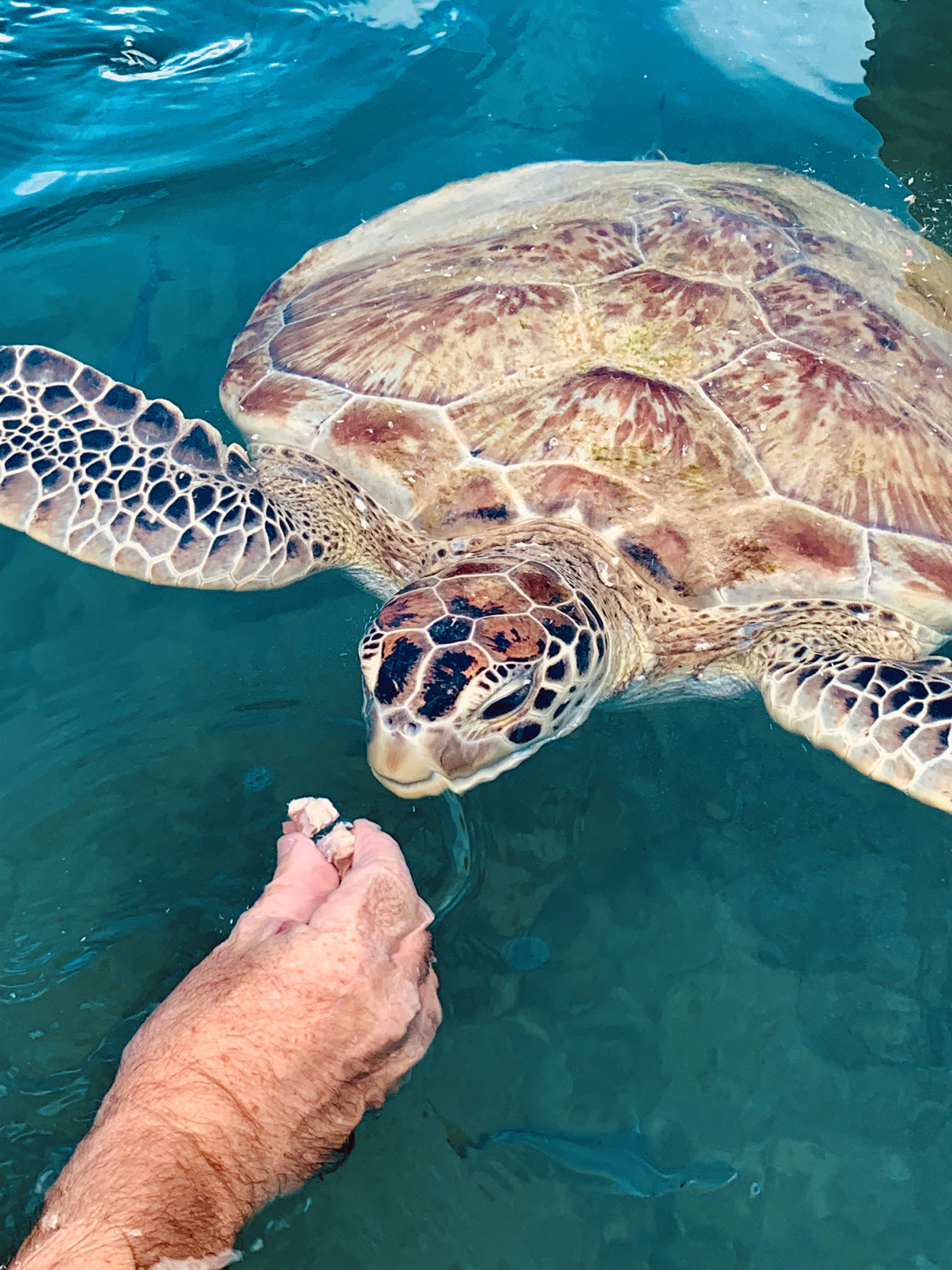 Our hearts skipped. What a brilliant creature to know to come to us for food. We’ve seen turtles having relationships in Barbados with fishermen. Being omnivorous, turtles are known to hang around fishing boats for scraps. Still, she hadn’t been to Quest before. We hadn’t fed her before.