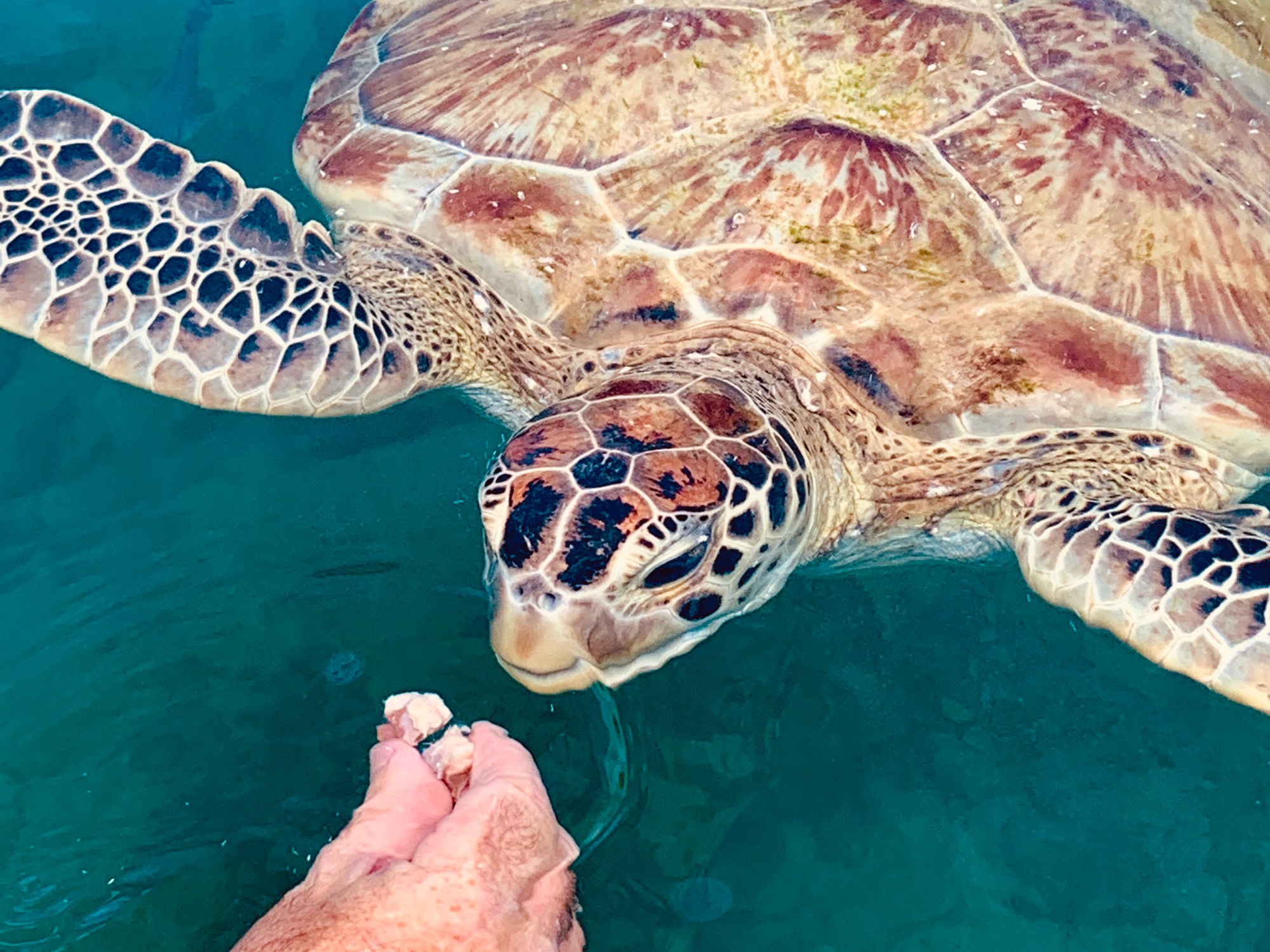 Our hearts skipped. What a brilliant creature to know to come to us for food. We’ve seen turtles having relationships in Barbados with fishermen. Being omnivorous, turtles are known to hang around fishing boats for scraps. Still, she hadn’t been to Quest before. We hadn’t fed her before.