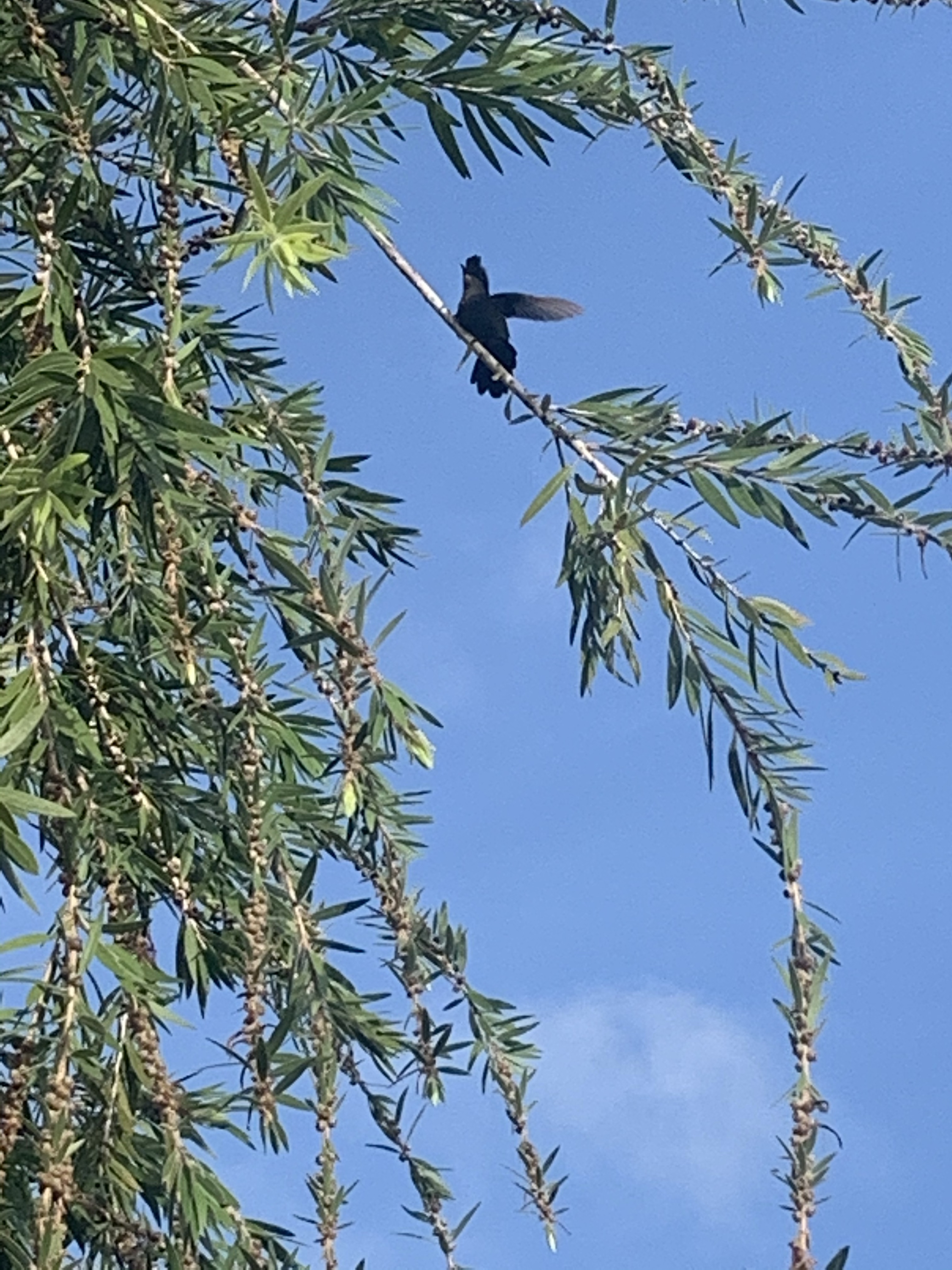 I got a piece of kitchen towel and scooped up the baby birds. Their hearts were beating through their paper-thin chests. Put them back in the nest and Eaon placed the nest back up in the tree. The parents – sparrow type birds – hovered nearby. An Antillean-crested hummingbird hovered around too. As small as a salt shaker.