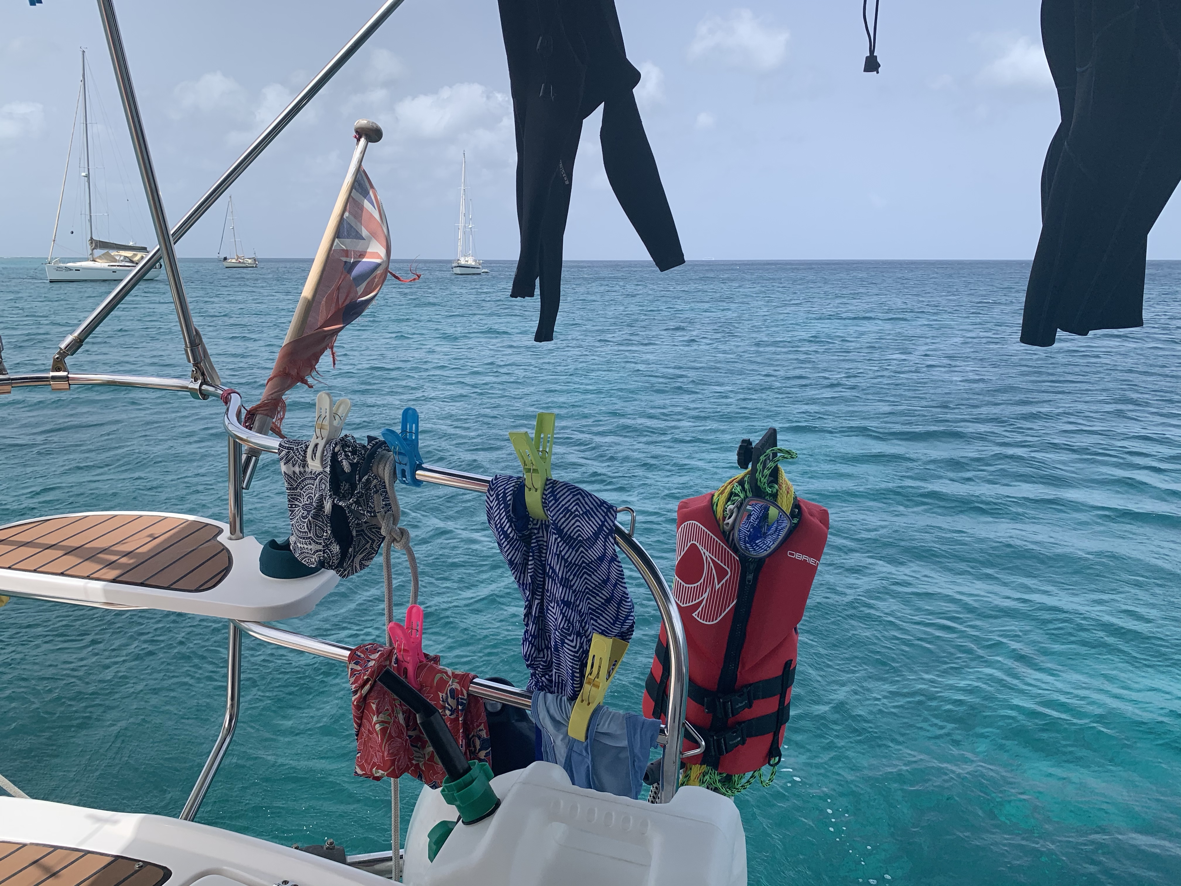 Me standing above a mountainous pile of wet cozzies: ‘Why the *#%^ does no one else know how to hang out their wet stuff on this boat besides me?’