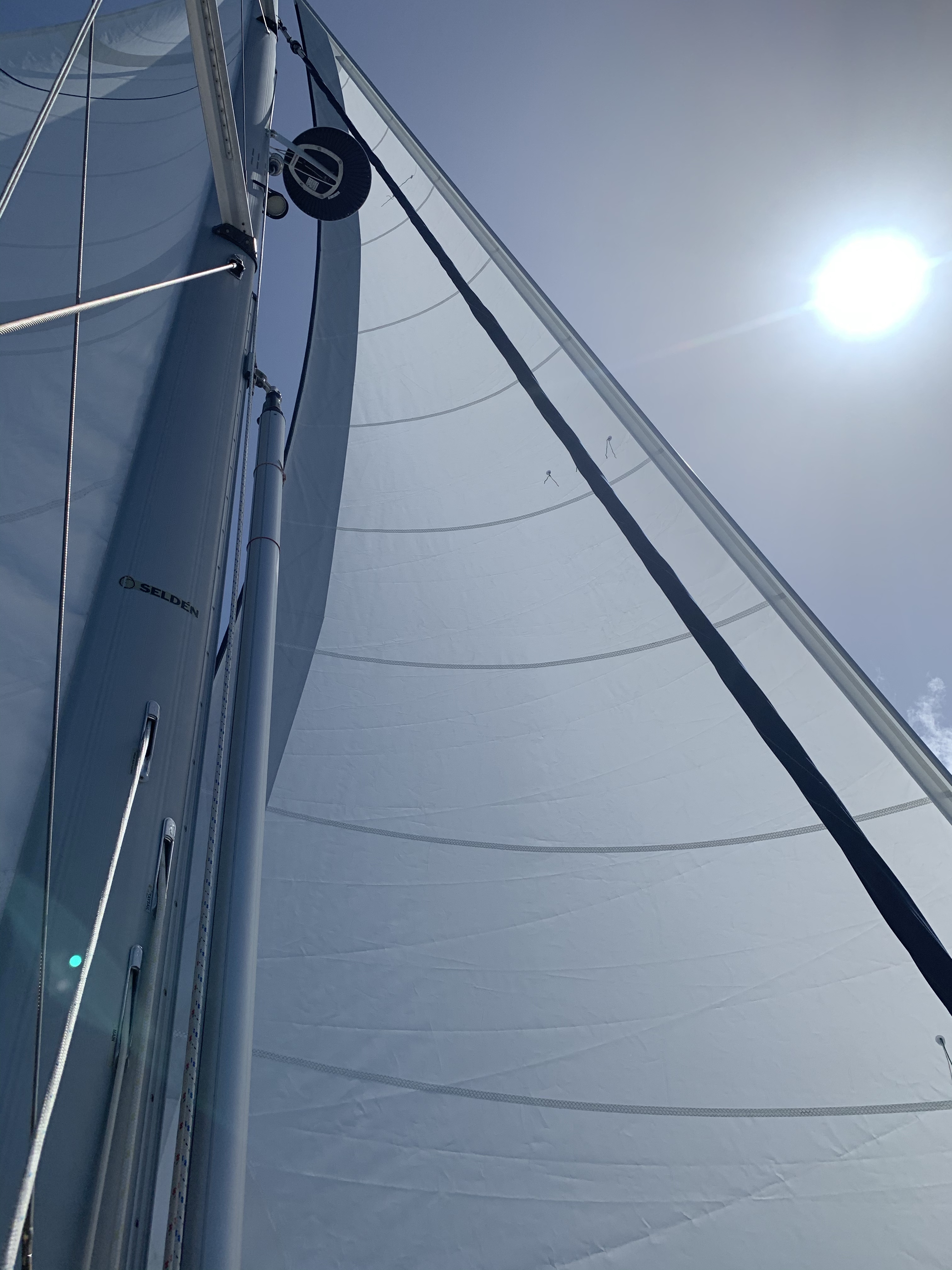 In June, we treated ourselves to a new headsail when it became clear we weren’t heading home. We’ve needed one for a while – flying Questie’s original headsail, which is as old as the boat. January 2008. We hadn’t really thought about it, but it was a pretty decent stretch of time for the ‘engine-room’ sail. Quest being cutter-rigged, with two sails before the main, has quite a small headsail, which helped to dissuade us that we needed a new one – at least compared those huge 140% headsails on other boats.