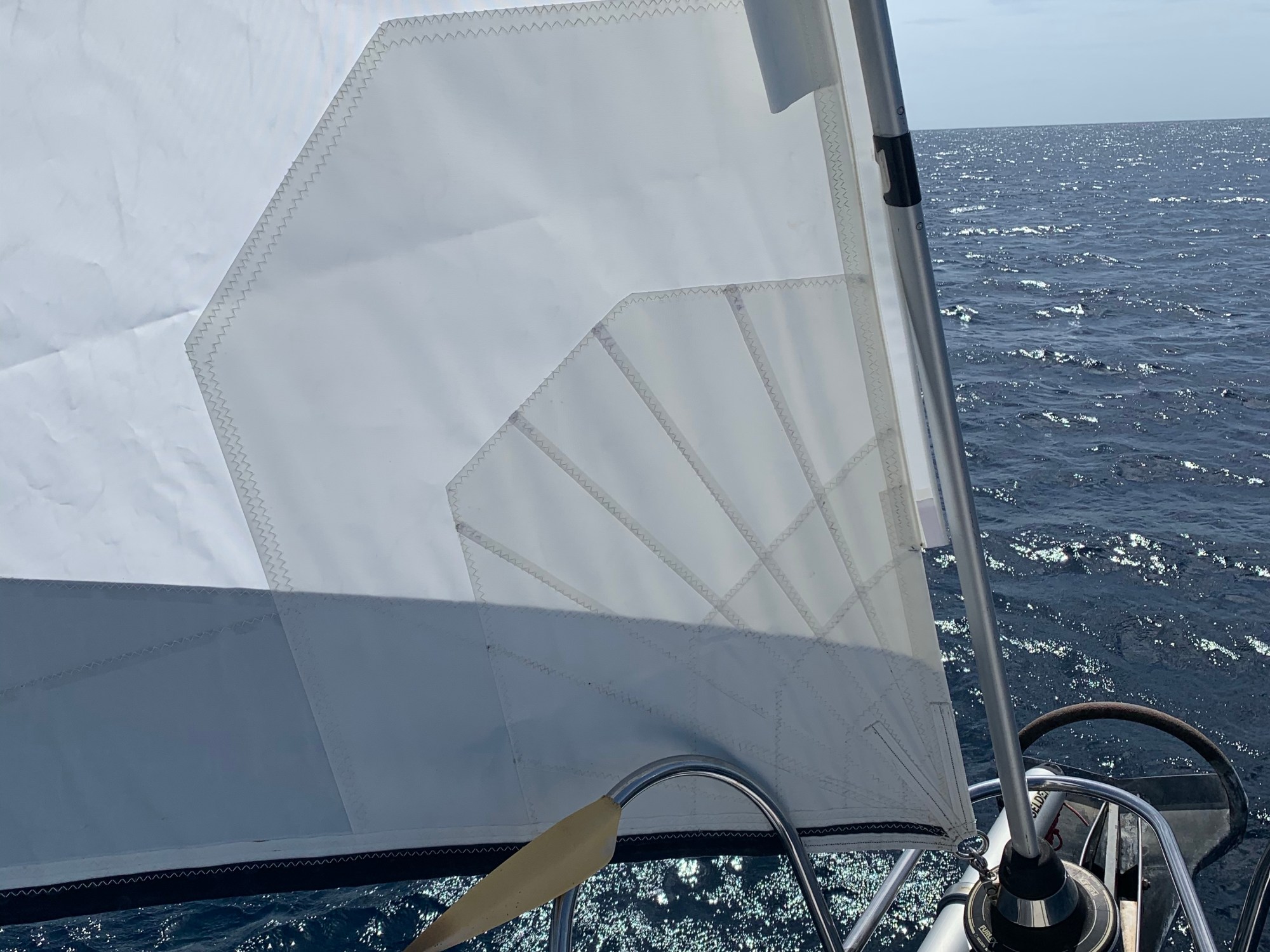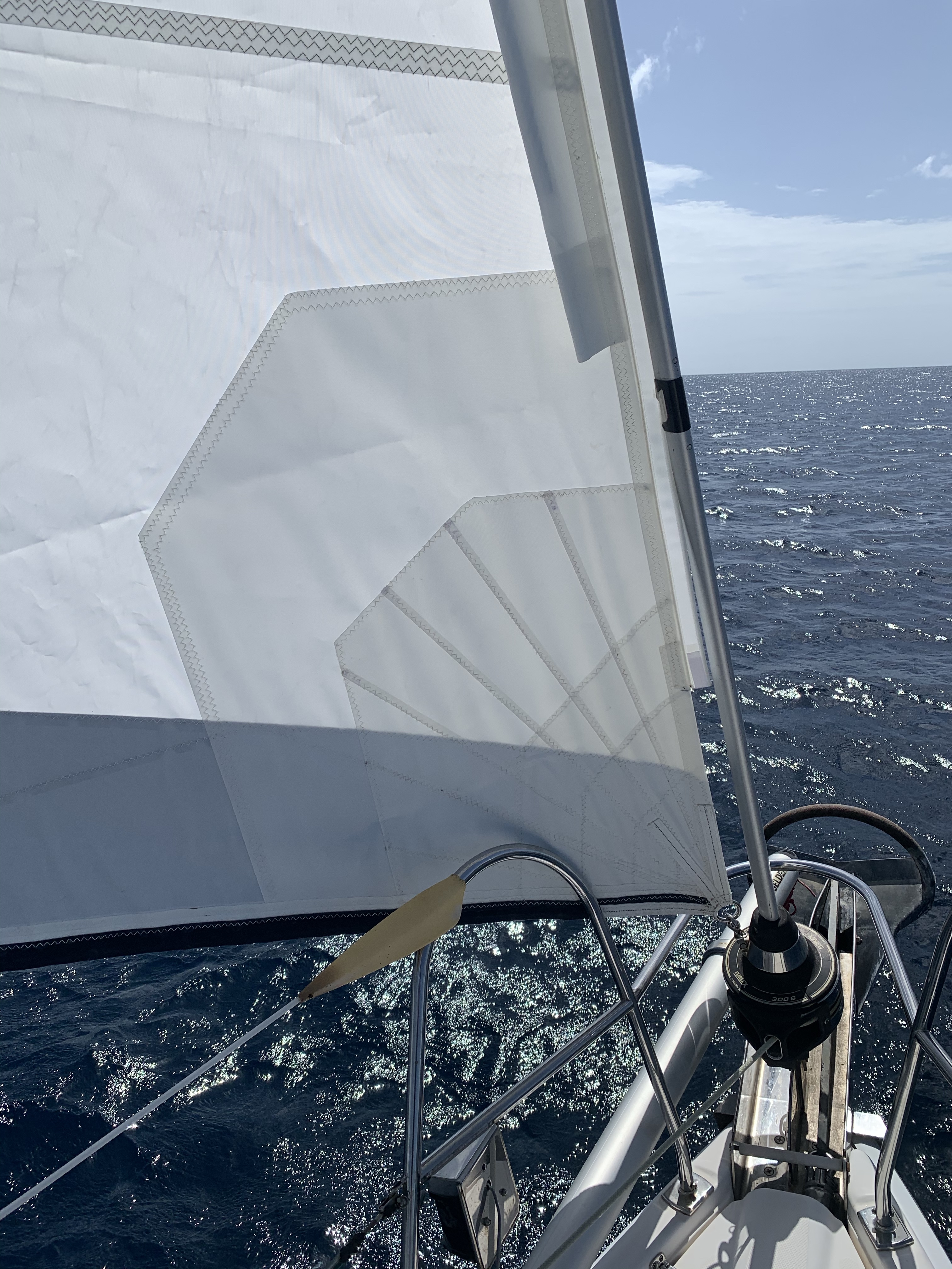 We’re making a steady 5-6 knots. Our mainsail is on the first reef – over halfway out, which is not so normal for us, since our mainsail is so big. The piéce de resistance is our new headsail. Have I mentioned it before?