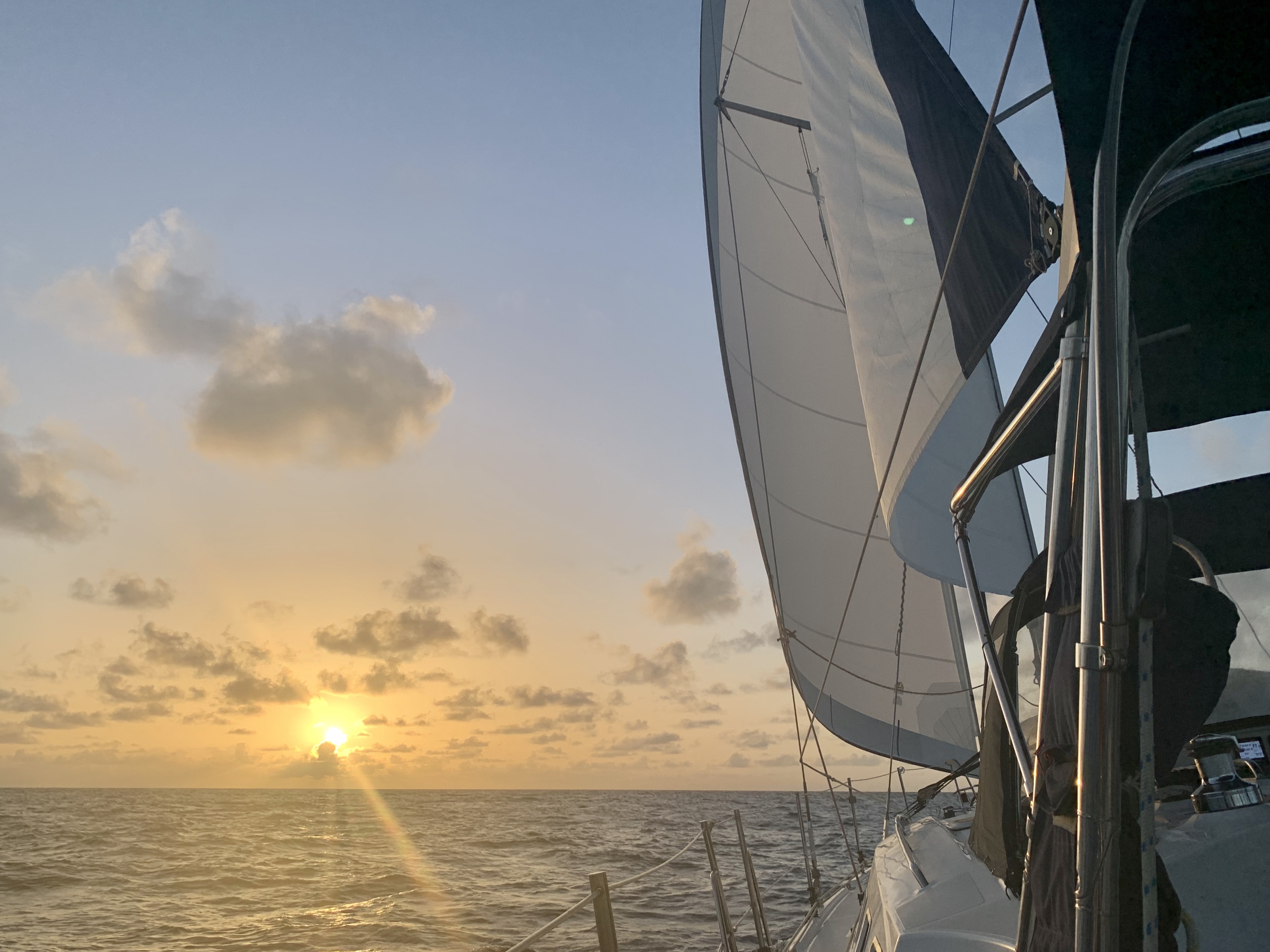 We are on a lovely broad reach. The wind is on our starboard quarter, blowing around 13knots. I was going to say not a squall in sight, but as I write this at 10:20pm, we’ve been covered in a misty rain. No bother. The wind hasn’t ramped up to 30 knots, so it doesn’t really count.