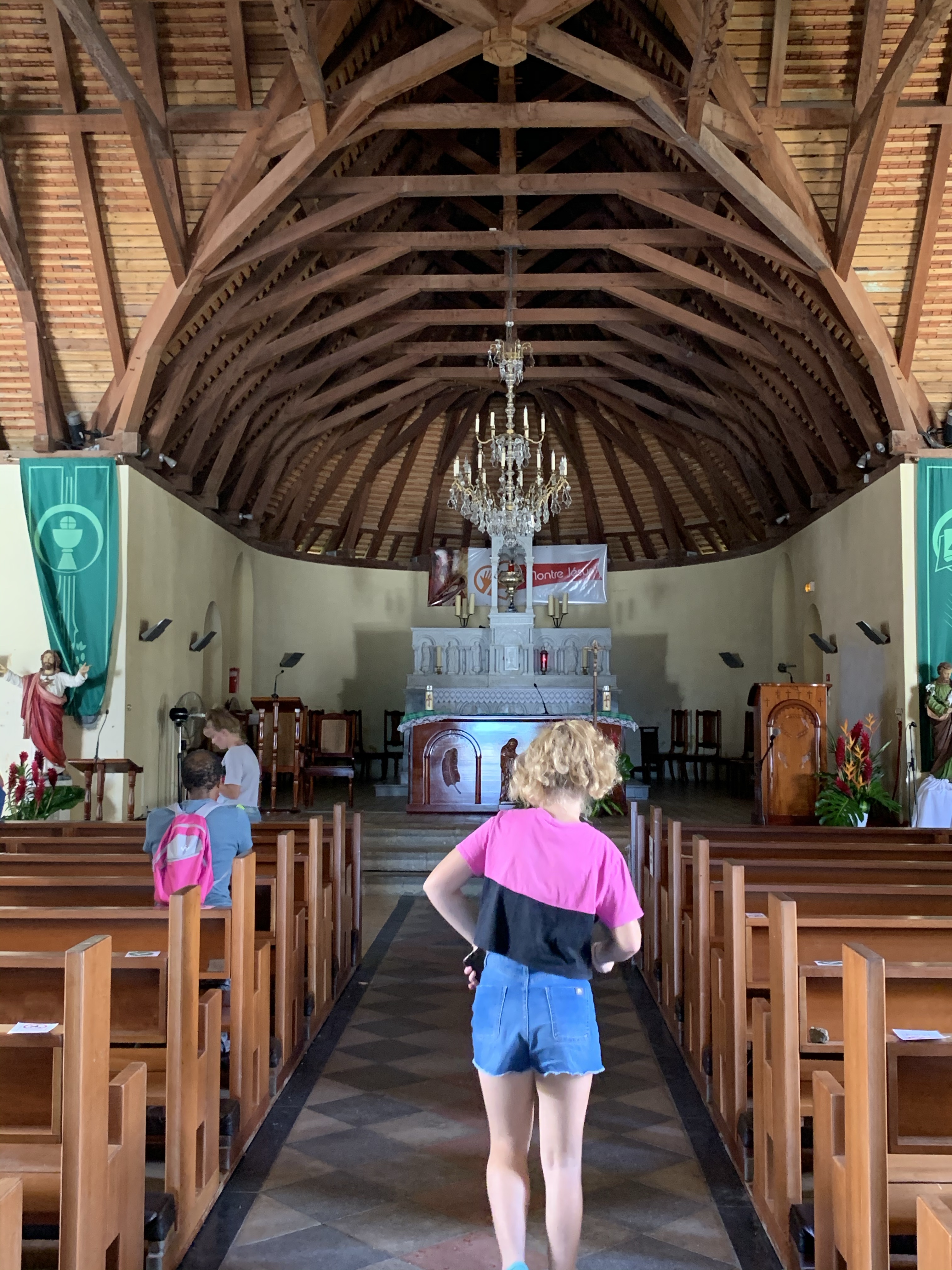 We found the little town’s plaza full of empty, shady benches. The nearby beautiful church was lonely too, save for one person praying on a pew. We tiptoed past him.