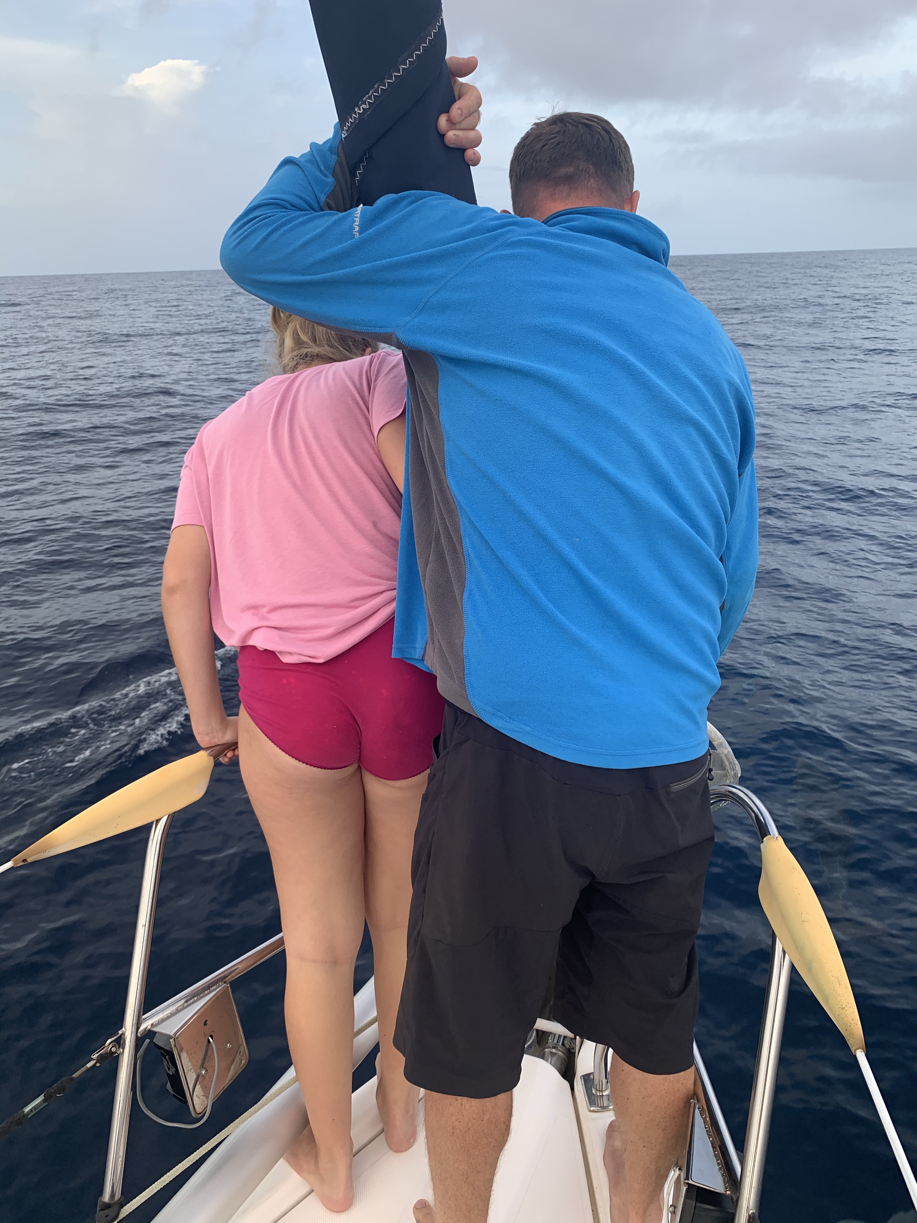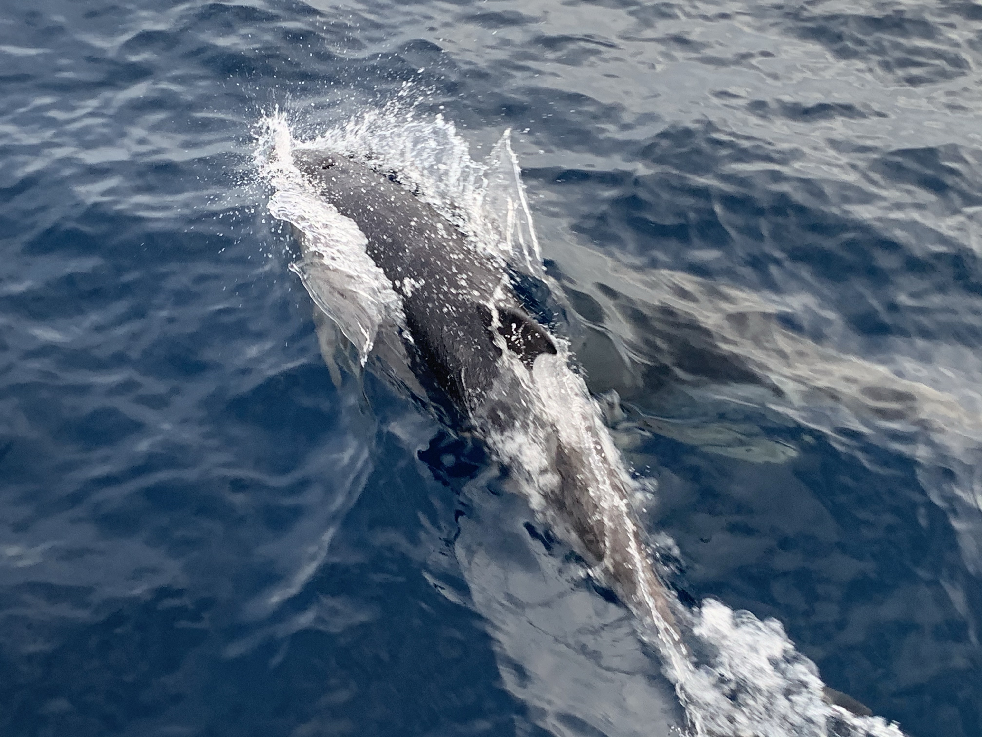 A cloudy mill pond. To be honest, it feels like a summer’s day in Wales. And with it, a pod of beefy, Welsh-looking bottlenoses bow-surfed with us first thing. We went to the front to watch. We could hear them squeak and whistle. The blow holes like snorkels reaching for breath. The bodies scratched and individualised. They must be like, ‘That’s Marvin, cause he has the row of scratches. Lisa’s got that remora fish always stuck to her tail.’