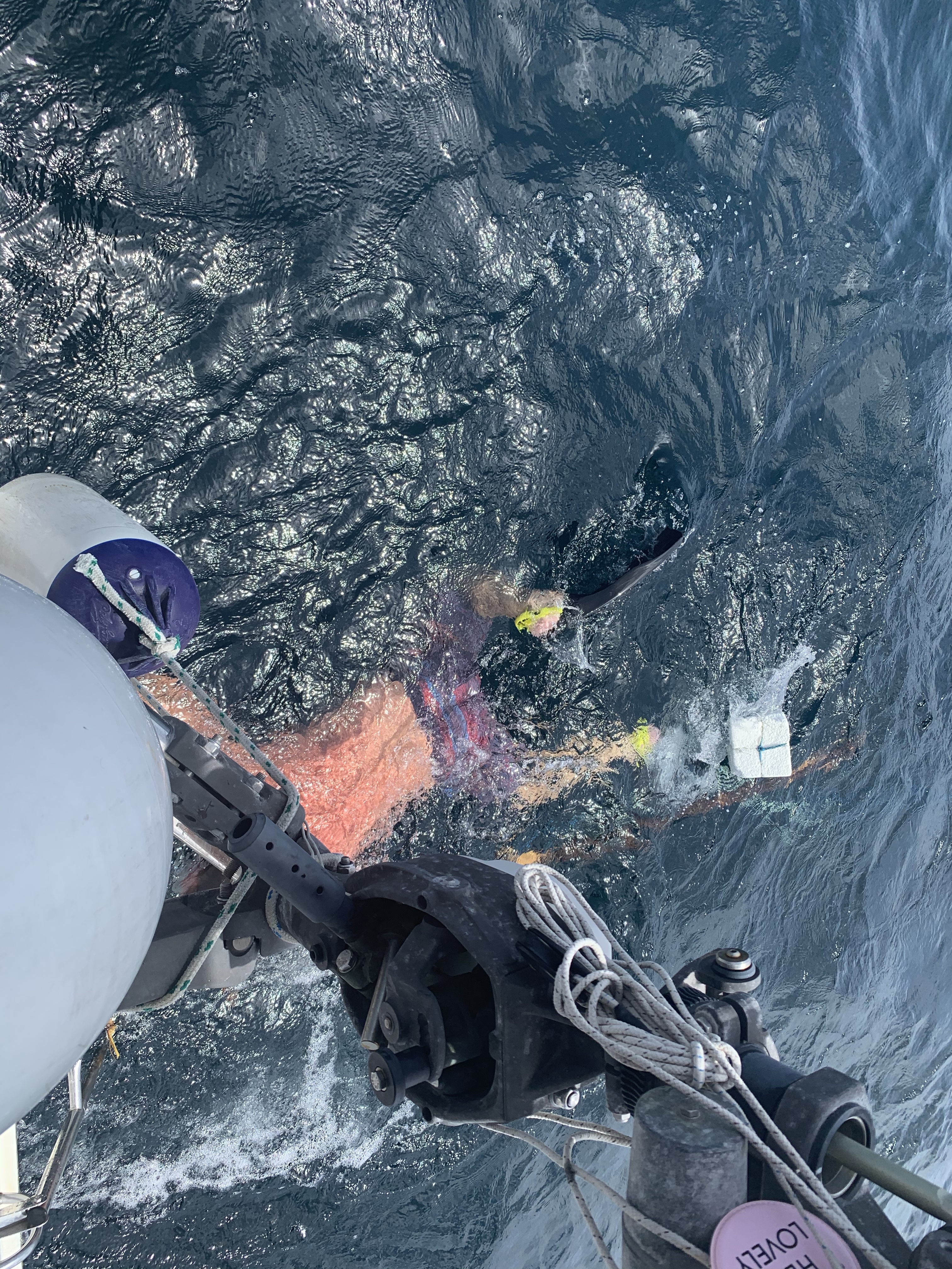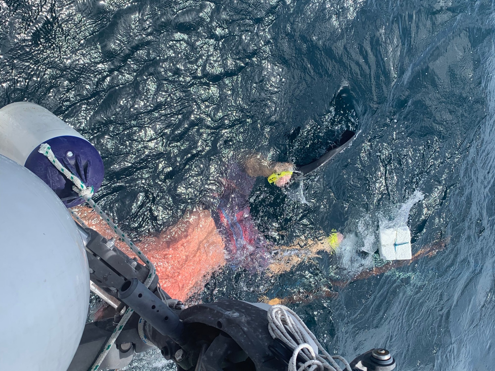 Jack jumped into the water to cut it free. He said the water, dive thousand metres deep at this point, was eerily grey under the surface. Luckily the rope was trailing from Quest’s rudder which is just at the back of Quest – and not wrapped around her propellor. That would have been trickier – and deeper to sort out. He took a paring knife and quickly cut.