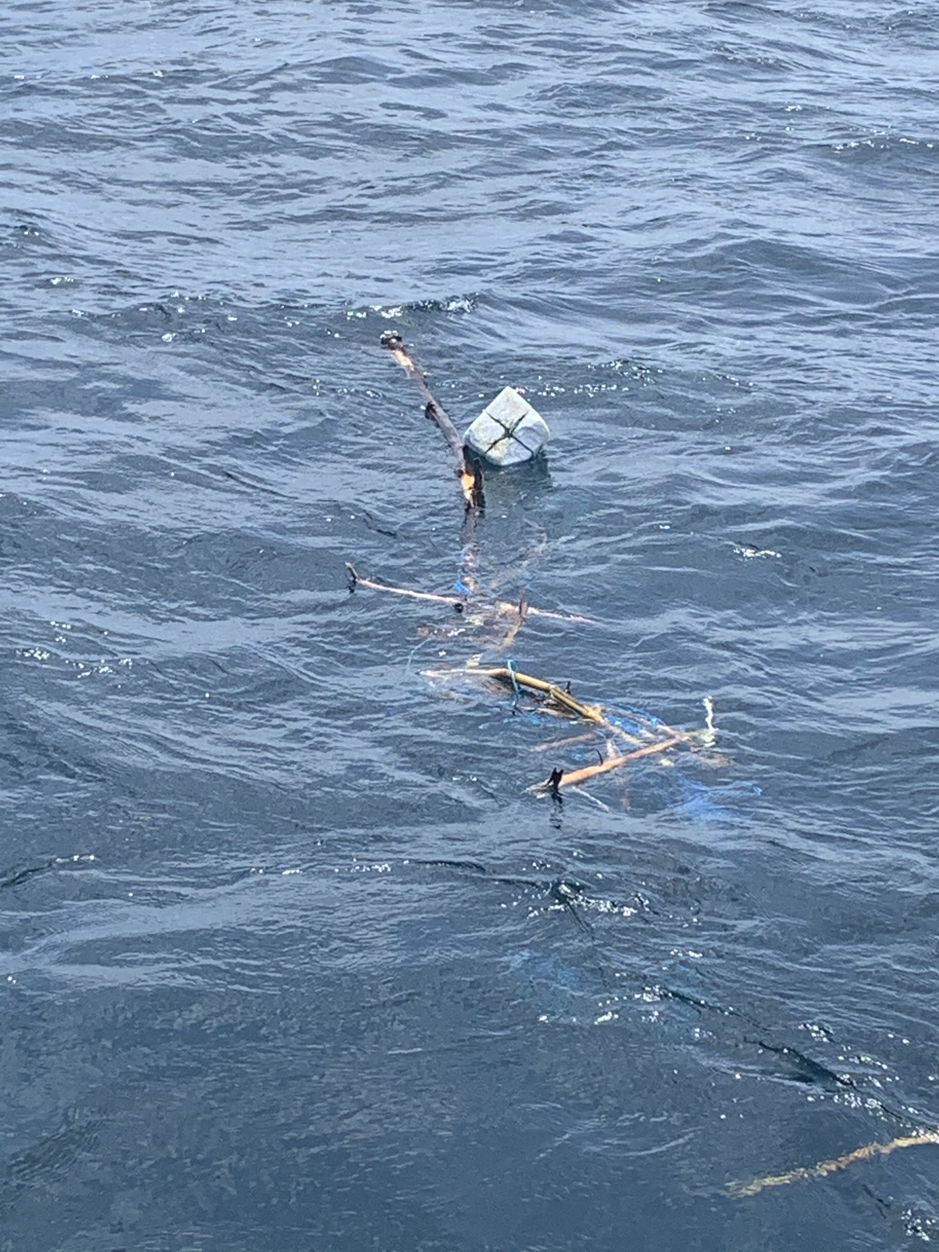 We picked up part of an old fishing pot and line. I spotted it trailing at the back of Quest. A big bamboo stick, some blue rope and a styrofoam marker.