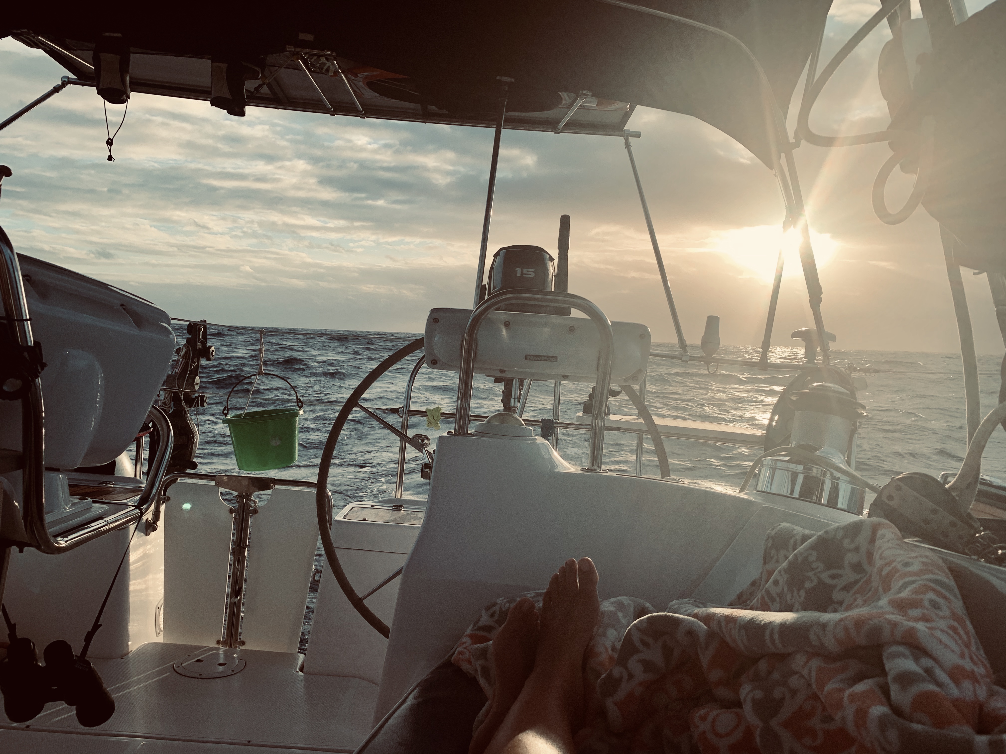Both girls went down after supper and sunset. We had toast (technically fried bread) with a variety of French condiments. The girls are such good passage-makers. They sort themselves out into an instant, amiable rhythm. It makes me smile. That’s a muscle memory.