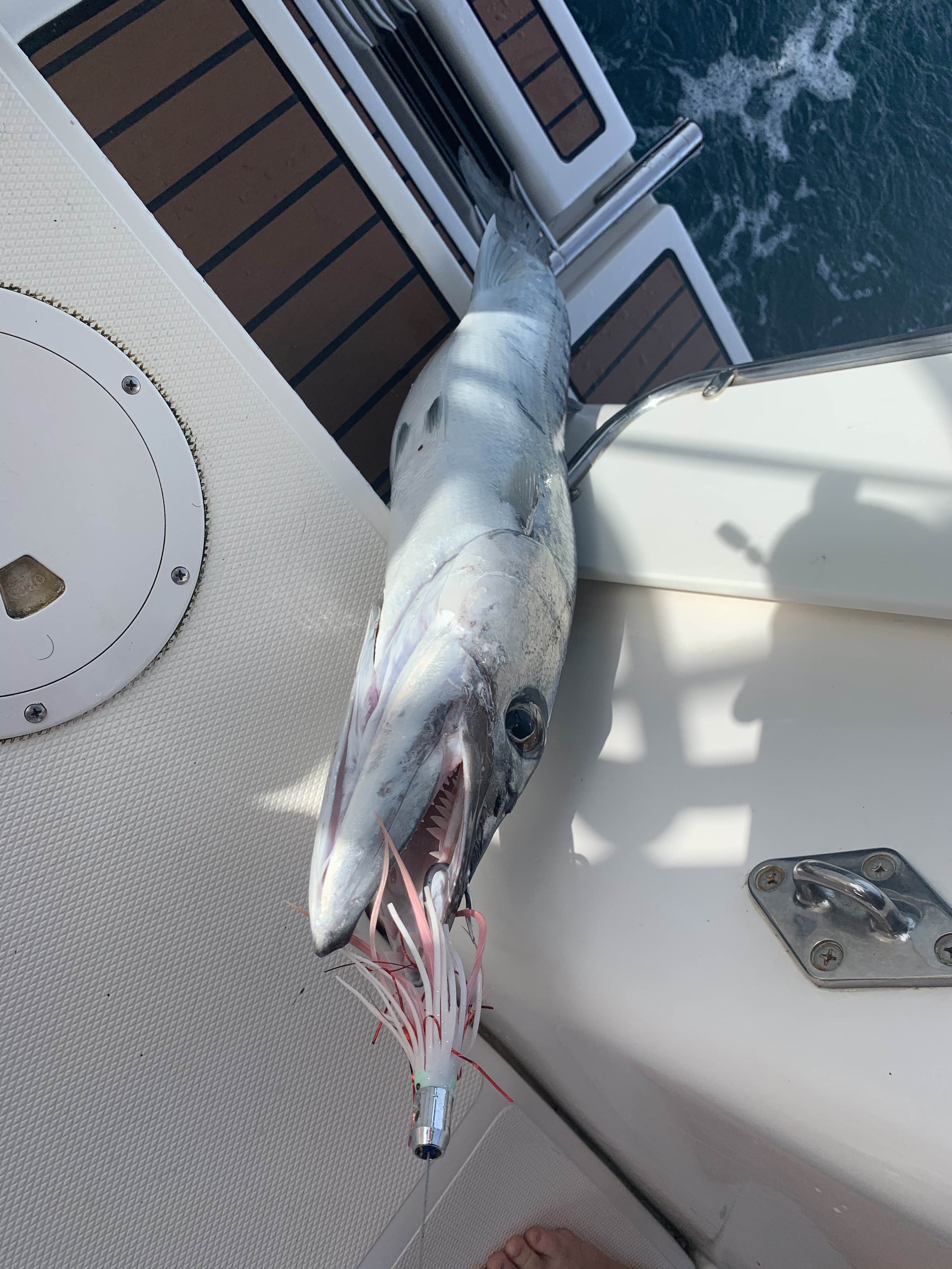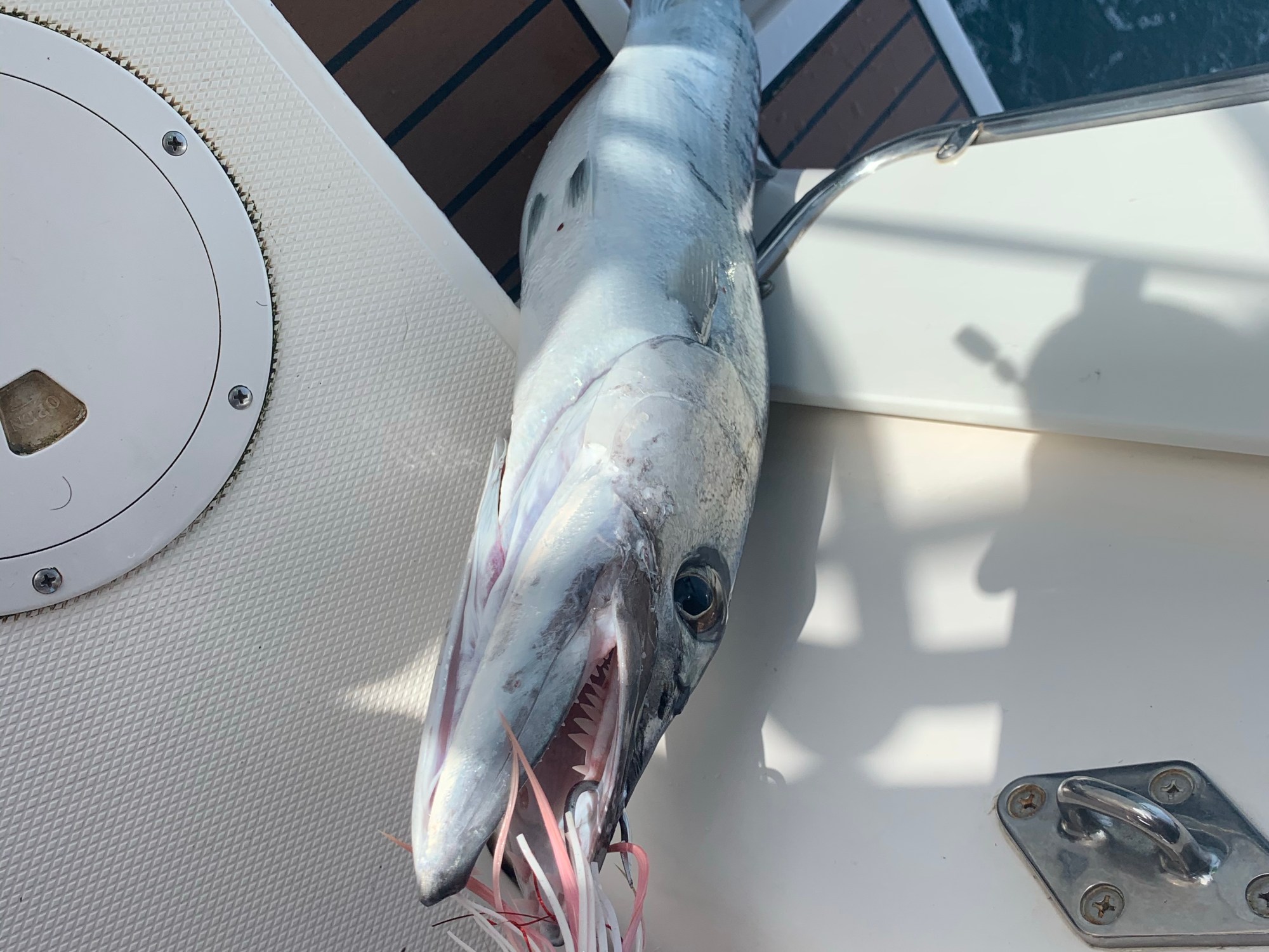 Just before sunset, we caught a large barracuda on the fishing line. Some people happily eat them, but we aren’t so keen. It was so big, Jack couldn’t free the hook with his normal pliers. I had to go below and find the big ones.