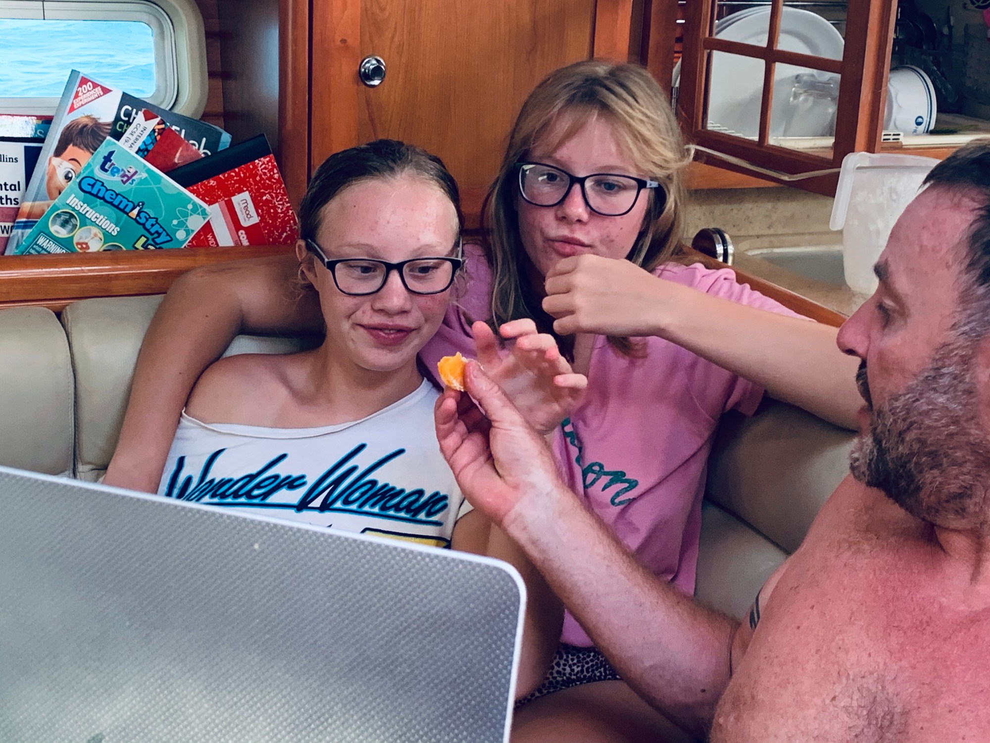 I’m hiding in the front cabin. Well, I’m not exactly hiding. I’m lying in bed listening to the Ormerods watch Game of Thrones. They are on the finale of season 4. Halfway through. They started watching in Barbados – after s/v White Arrow kindly lent us their movie hard drive – and we found the whole Game of Thrones on it. We’ll have that, thank you. Excellent quarantine material.
