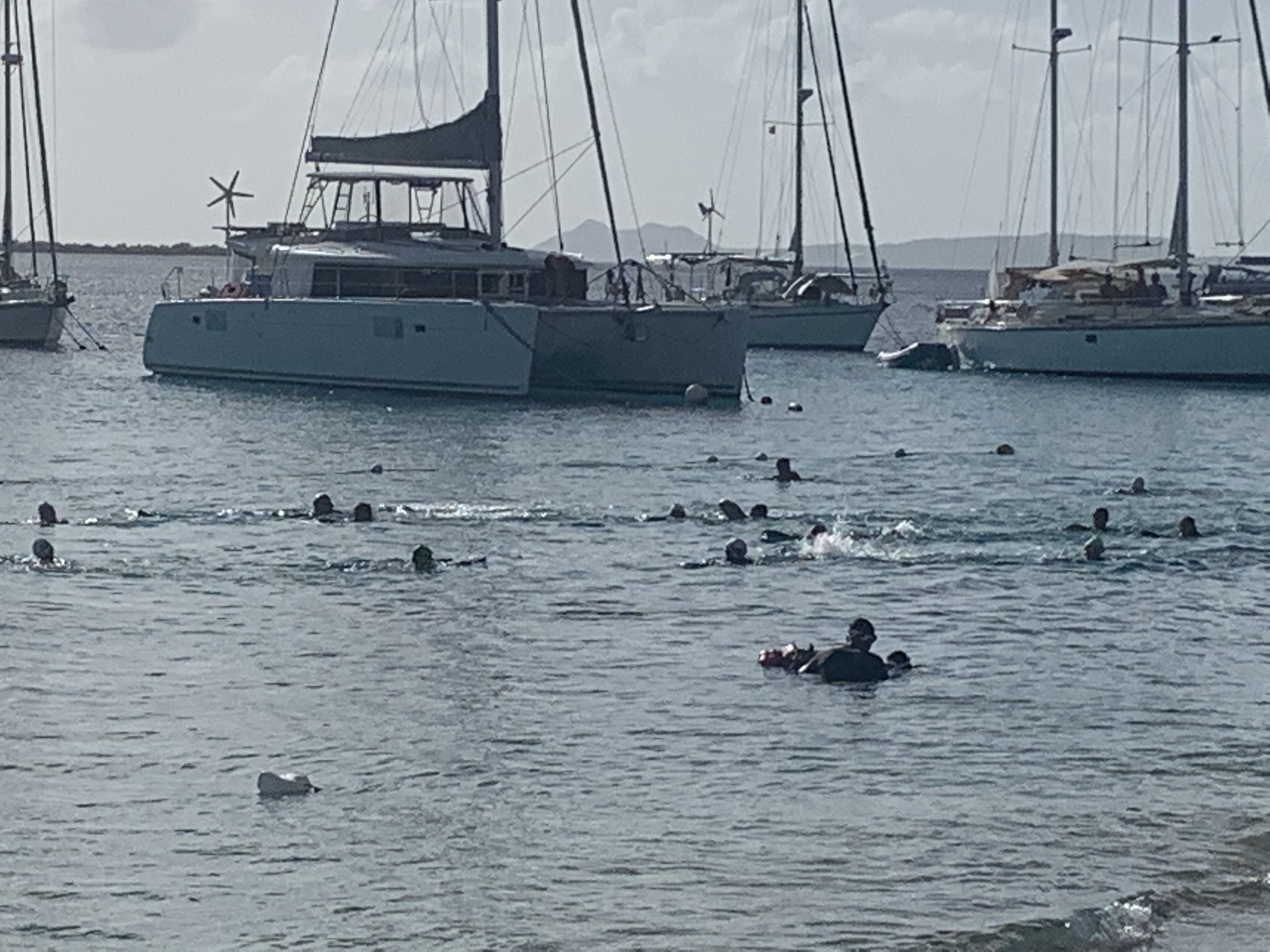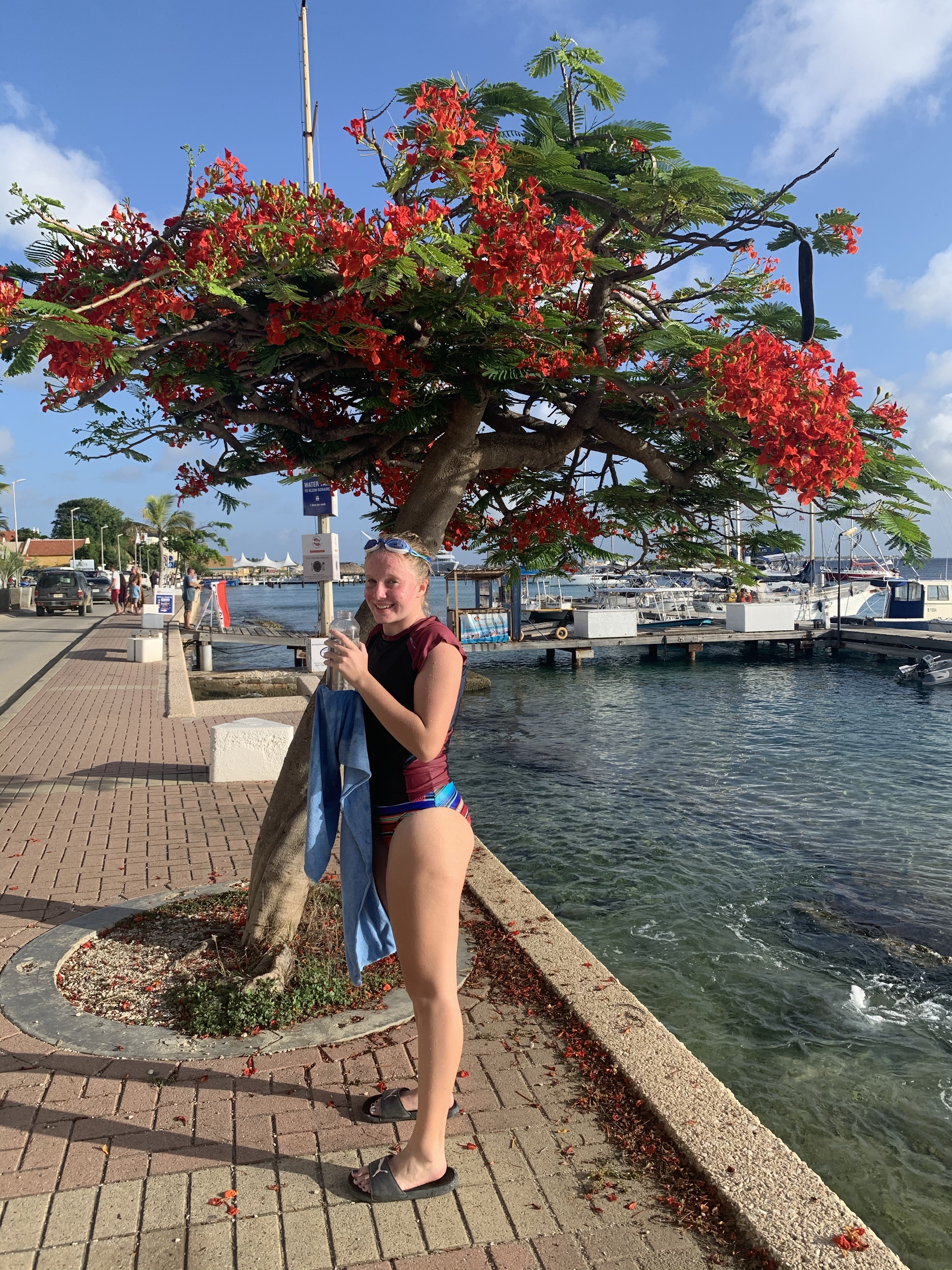 She is swimming in a sea pool, buoyed off by floats. About twenty local kids from Bonaire of different ages and abilities are doing the breaststroke down one length, finishing at the tree on the prom. Then the backstroke back.