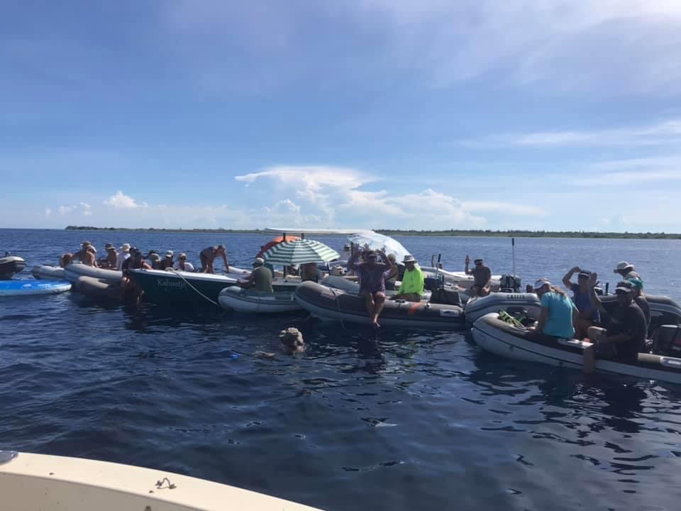 We went to join a cruiser’s dinghy drift with these tall pragmatic people over the weekend. They tie their dinghies together and literally drift out into open water. Some of the cruisers bring ordinary parasols, which they attach to their engine throttles. It makes for good shade. We came in slowly on Edna – as some cruisers were swimming around the drifting dinghies, keeping cool.