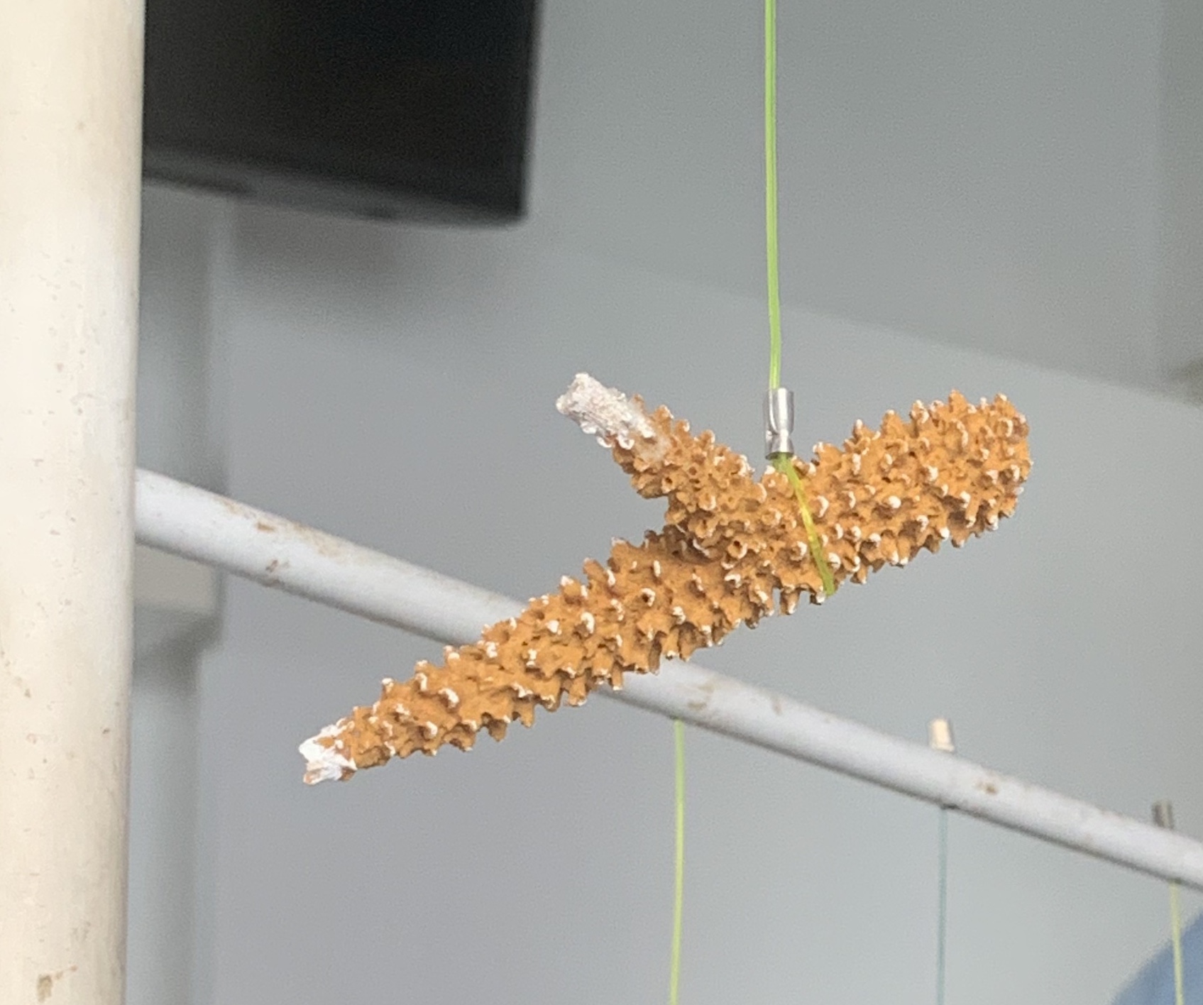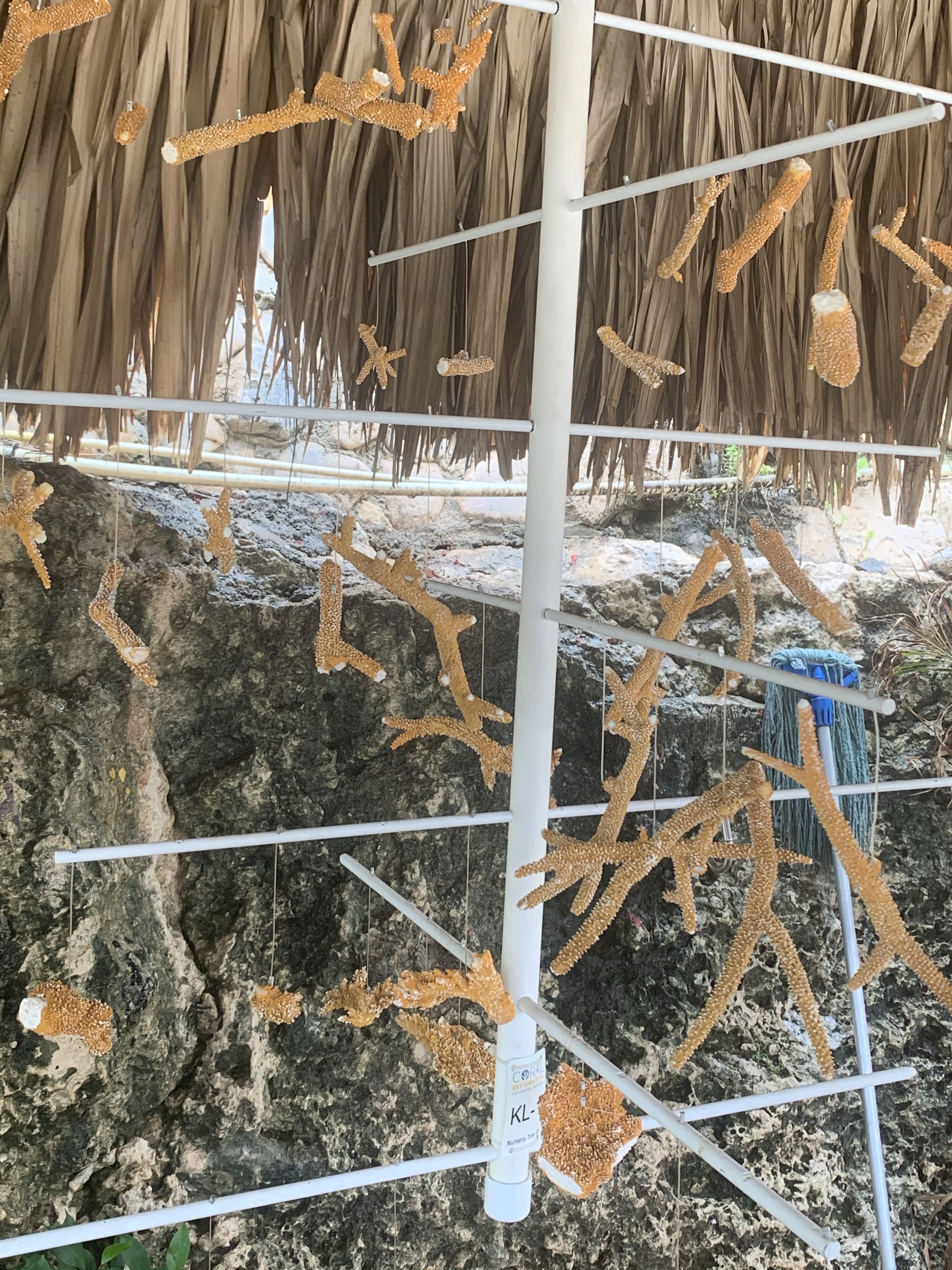 We had helped, on our last dive, to cut and tie four-month old staghorn coral onto bamboo frames set into the ground. We’d helped clean the nursery trees. Watched the pruning and tied new pieces of staghorn and elkhorn coral to grow. Meat and potatoes. I just wouldn’t mind a bit of British laughter at the end. Little swearing thrown in.