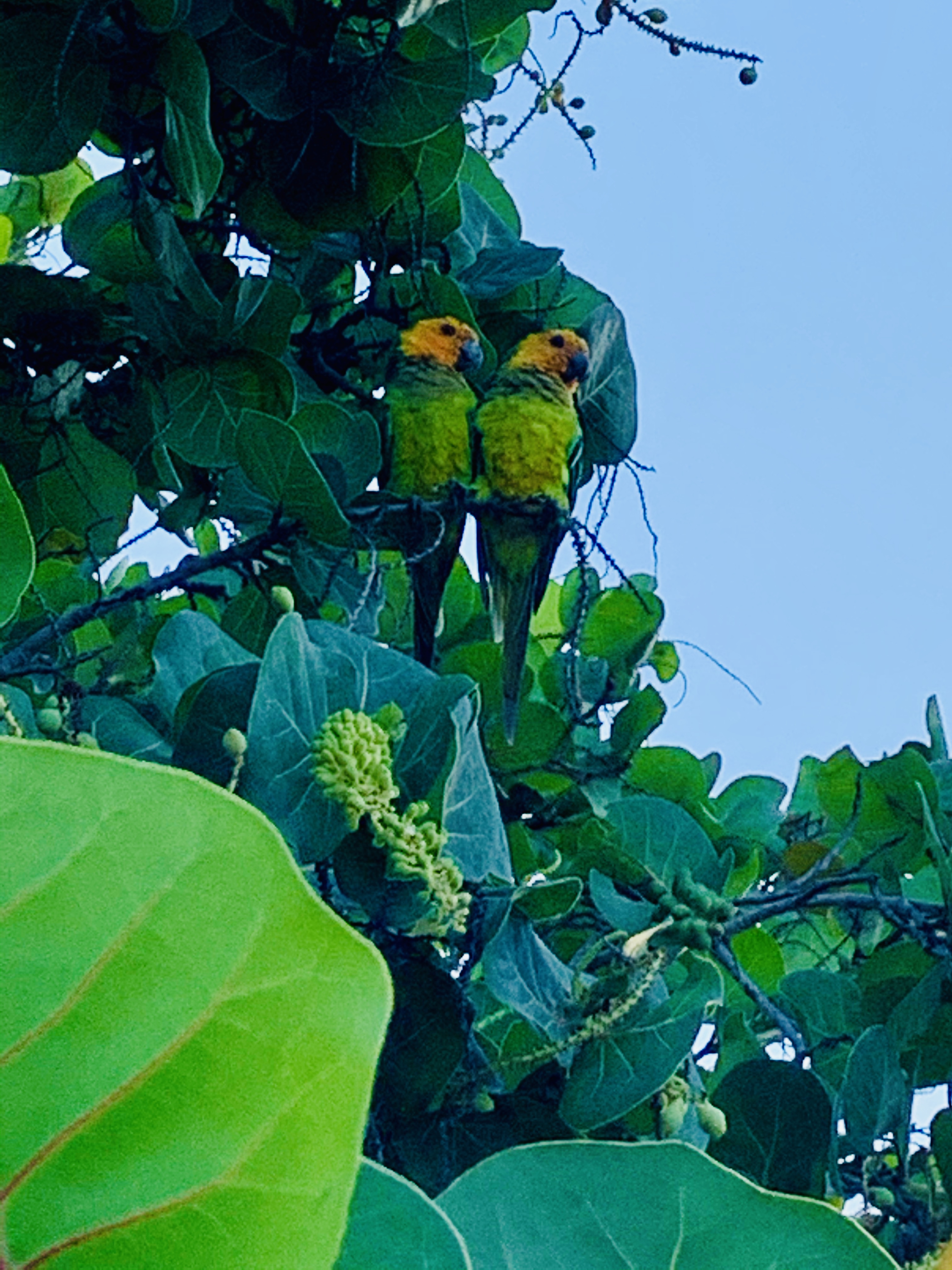 The birds are brown-throated parakeets. I googled it. They closely resemble Bonaire’s endemic yellow shouldered parrot, but with longer tail feathers and a darker head. The parakeets squawk away in the early sun and then disappear until sunset.