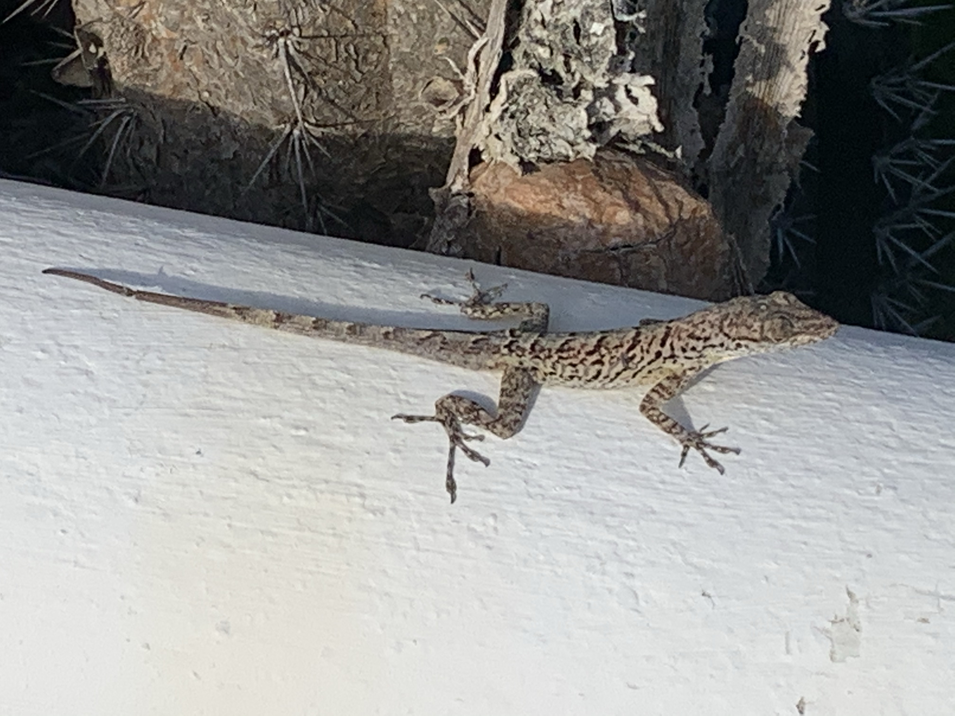 After watching the green parakeets, I came out of the marina showers and found a little speckled gecko just by the gates to our pontoon. It is called the Ruthven’s anole and is a subspecies endemic to Bonaire. It wasn’t scared of me coming close. It just sat there, soaking up the sun.