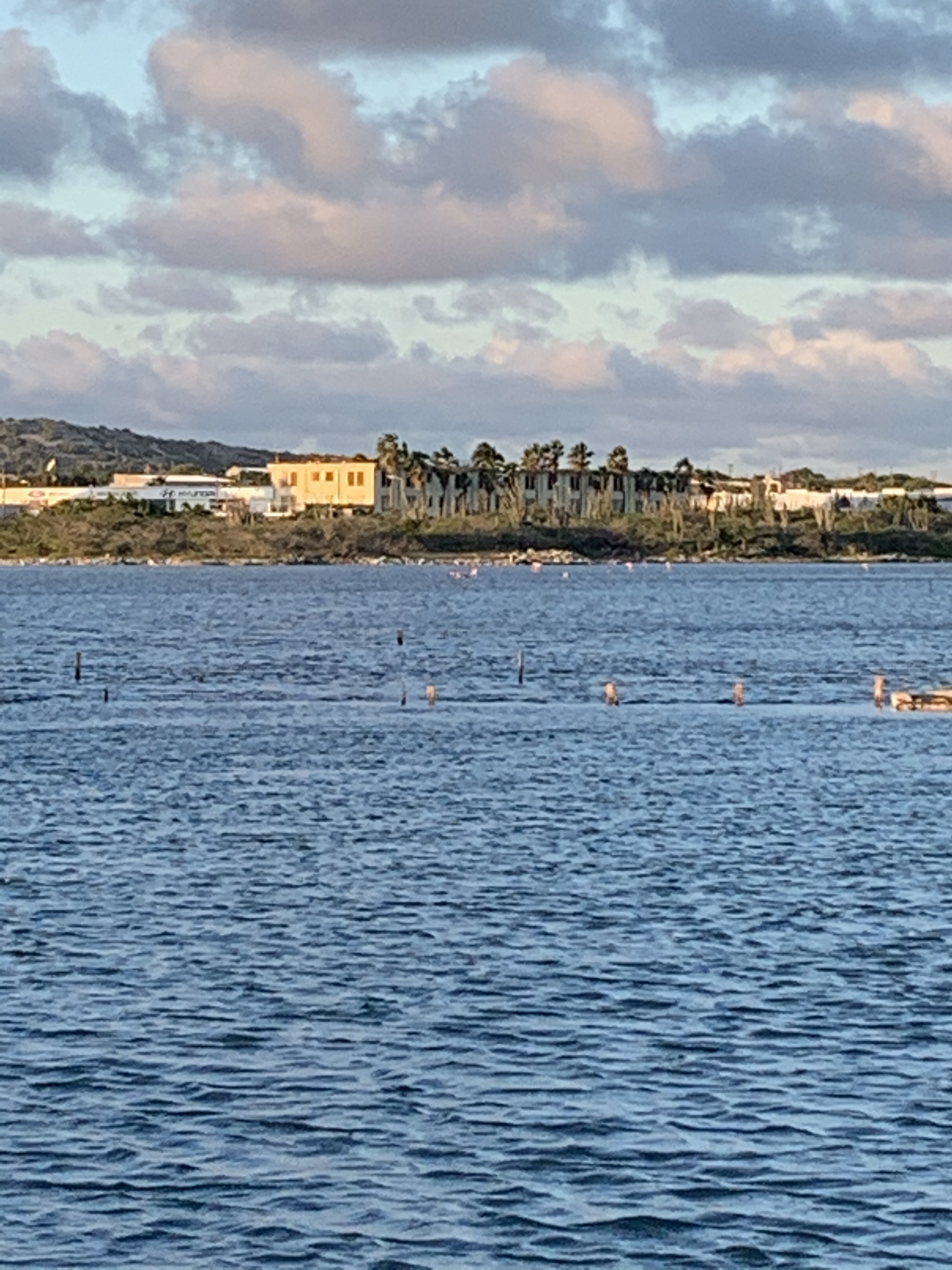 It’s sunset about now. I’ve just come out of the marina entrance. A flock of these parakeets are flying overhead. Where are they going? To roost somewhere in Bonaire’s dry forests apparently. I googled that too. In the morning they turn back up in the sea almond trees. We hear them making a happy racket.