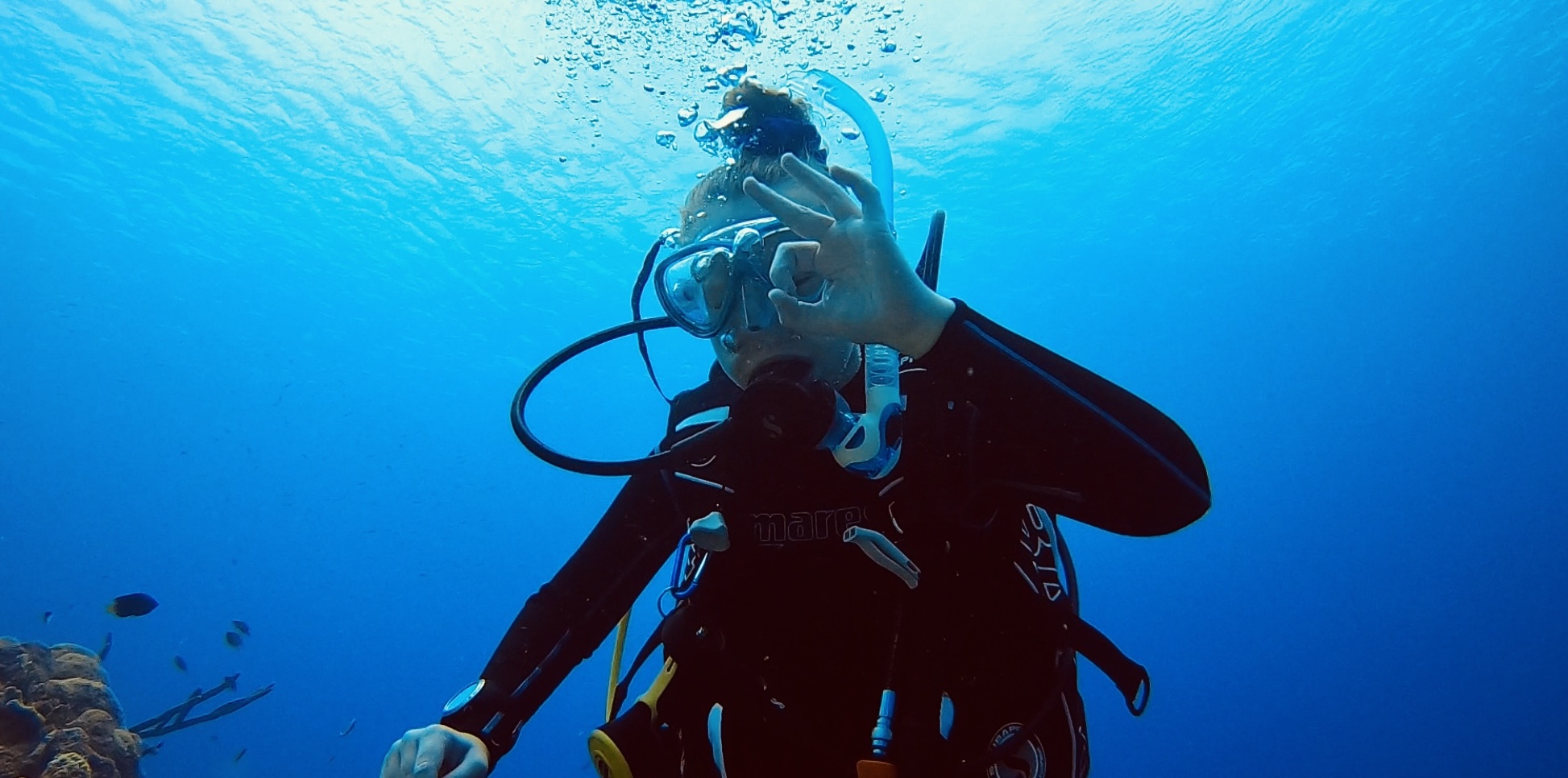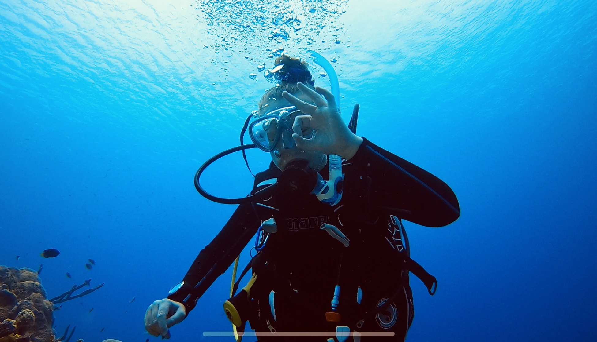 She’s definitely done a bunch of deep dives. That’s become her speciality, particularly as she, Jack and Patrice have been dive buddies over the last month. Bonaire makes this easy. The water is so clear here, you can dive deep and still have a clear view of the rippling surface.