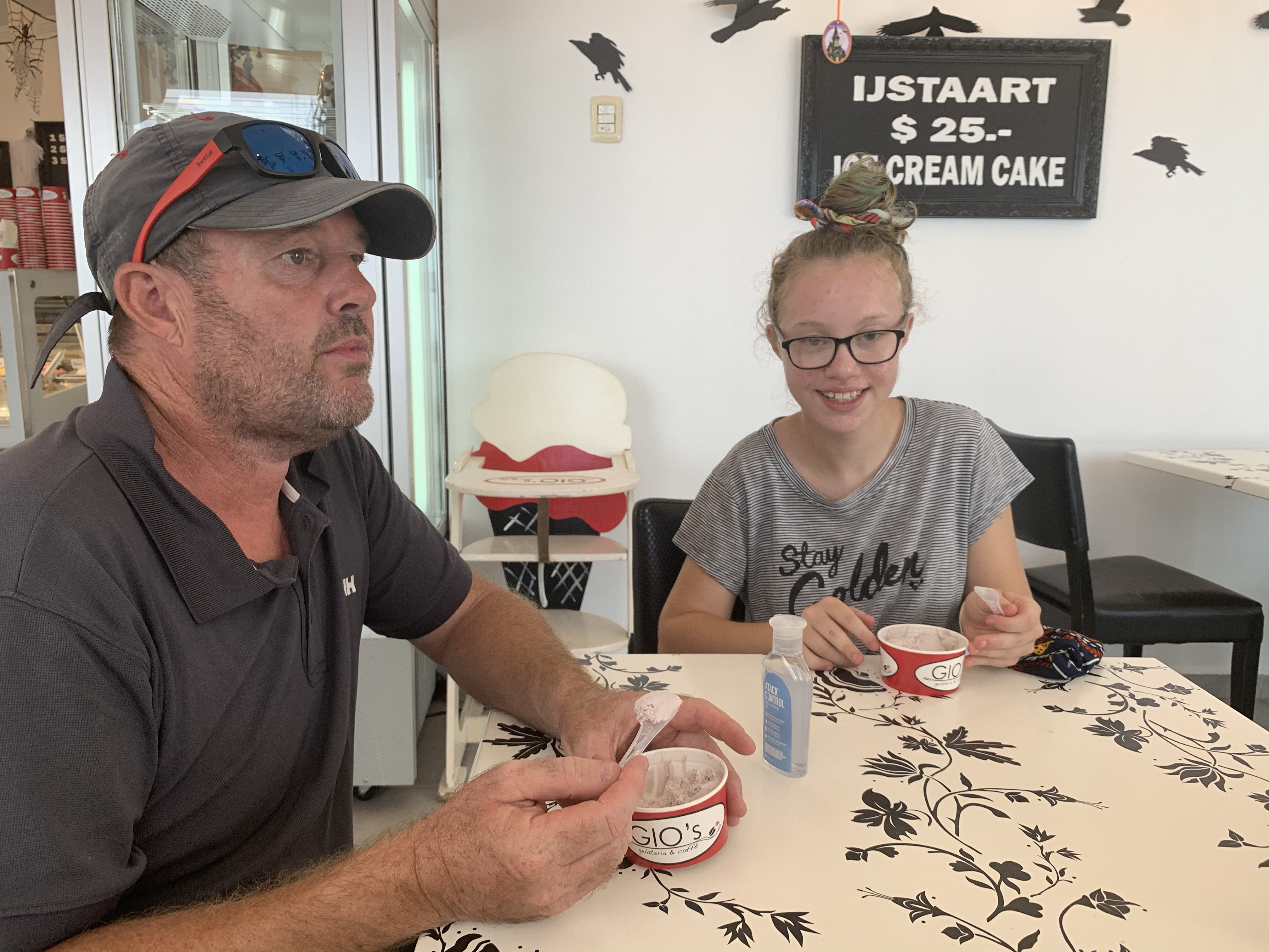 We took her for ice cream afterwards. We went to Gio’s, Bonaire’s famous ice cream shop. Five bucks for two scoops. Apple pie and blueberry.