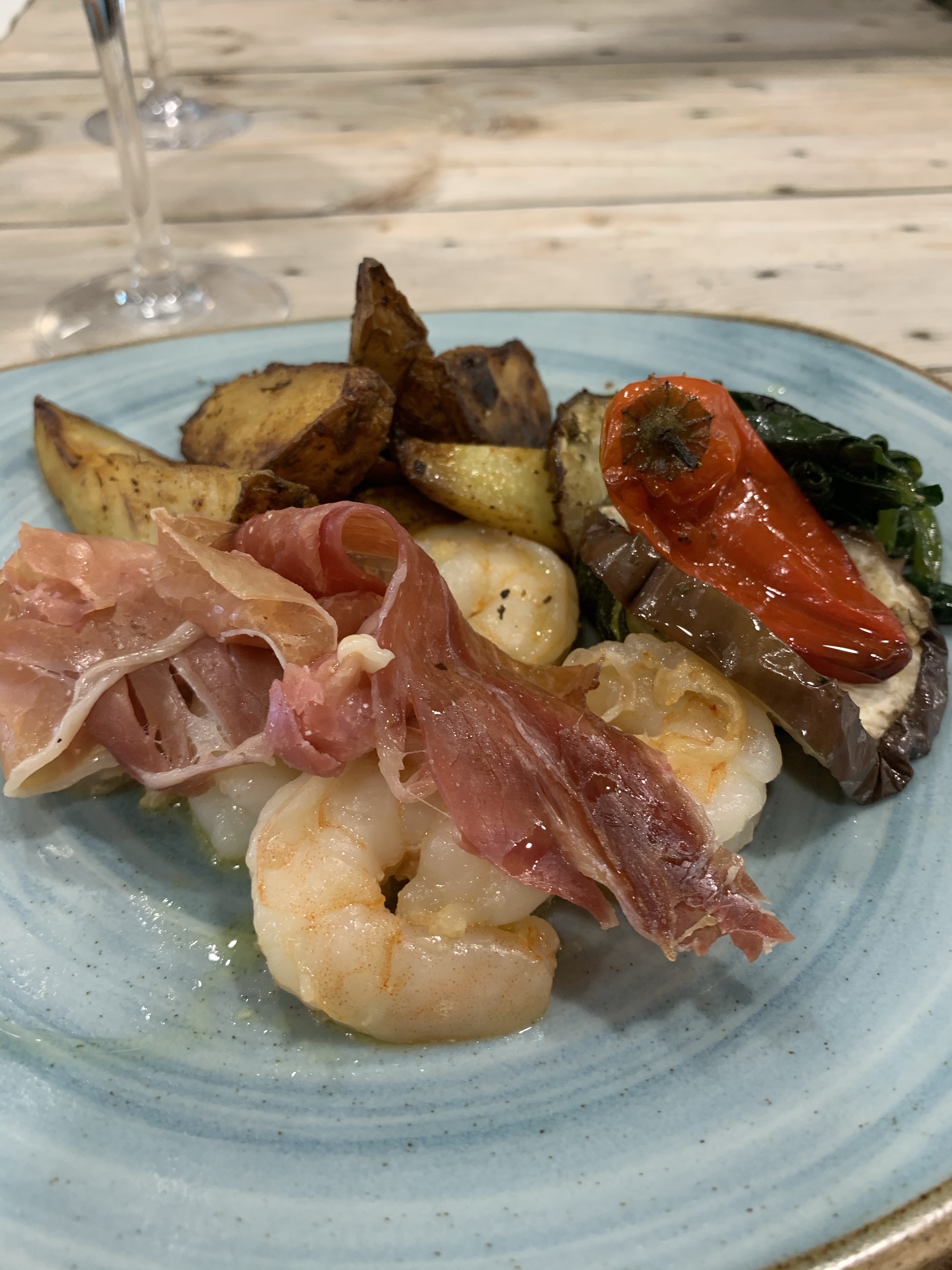 I had shrimp this week in a garlic sauce with potato wedges. Last time I had gnocchi. Last time I watched my friend Sue quaff down a beautiful limoncello sorbet for dessert. This week I had it. She had the local pastry with a marmalade sauce.