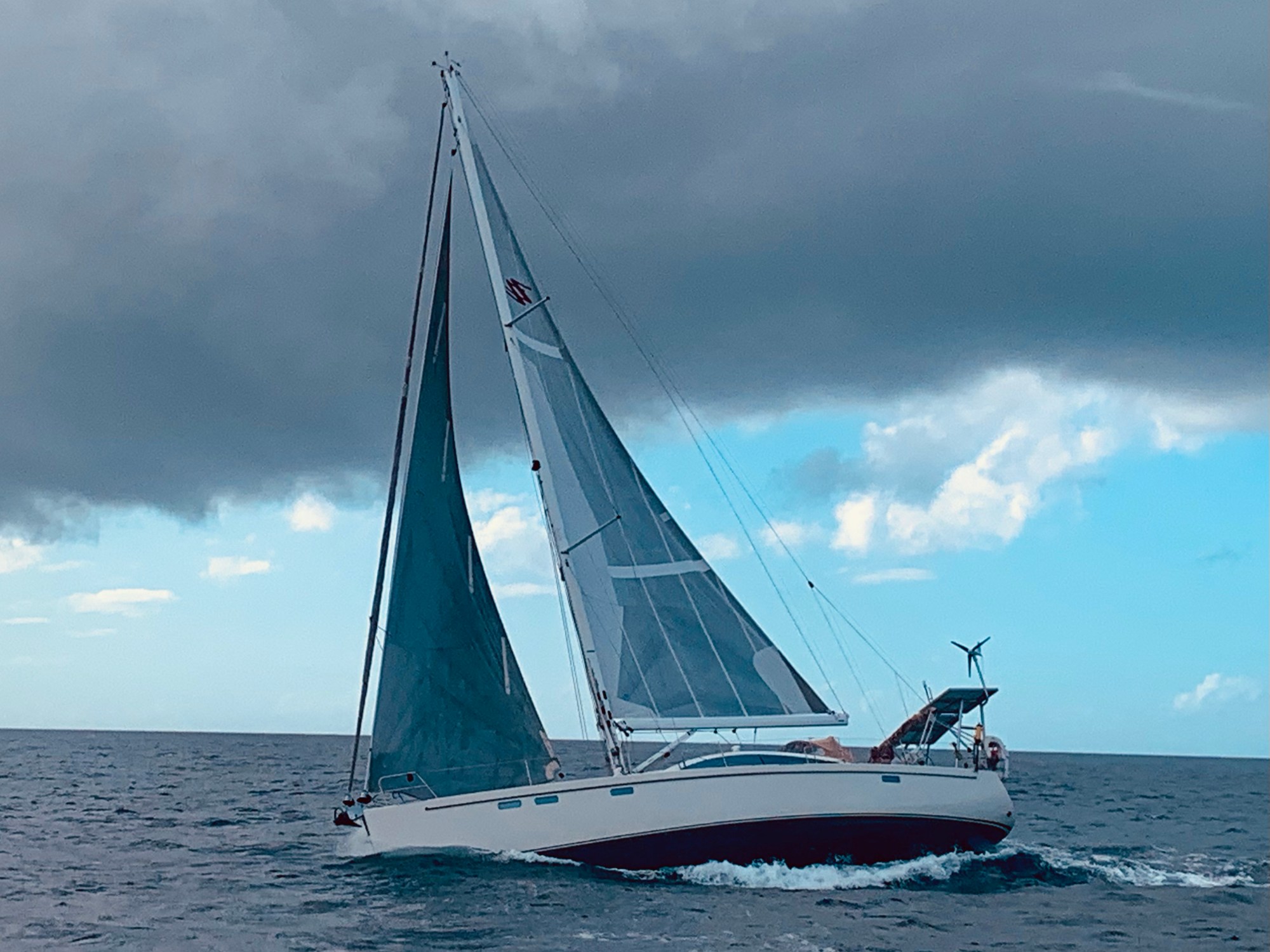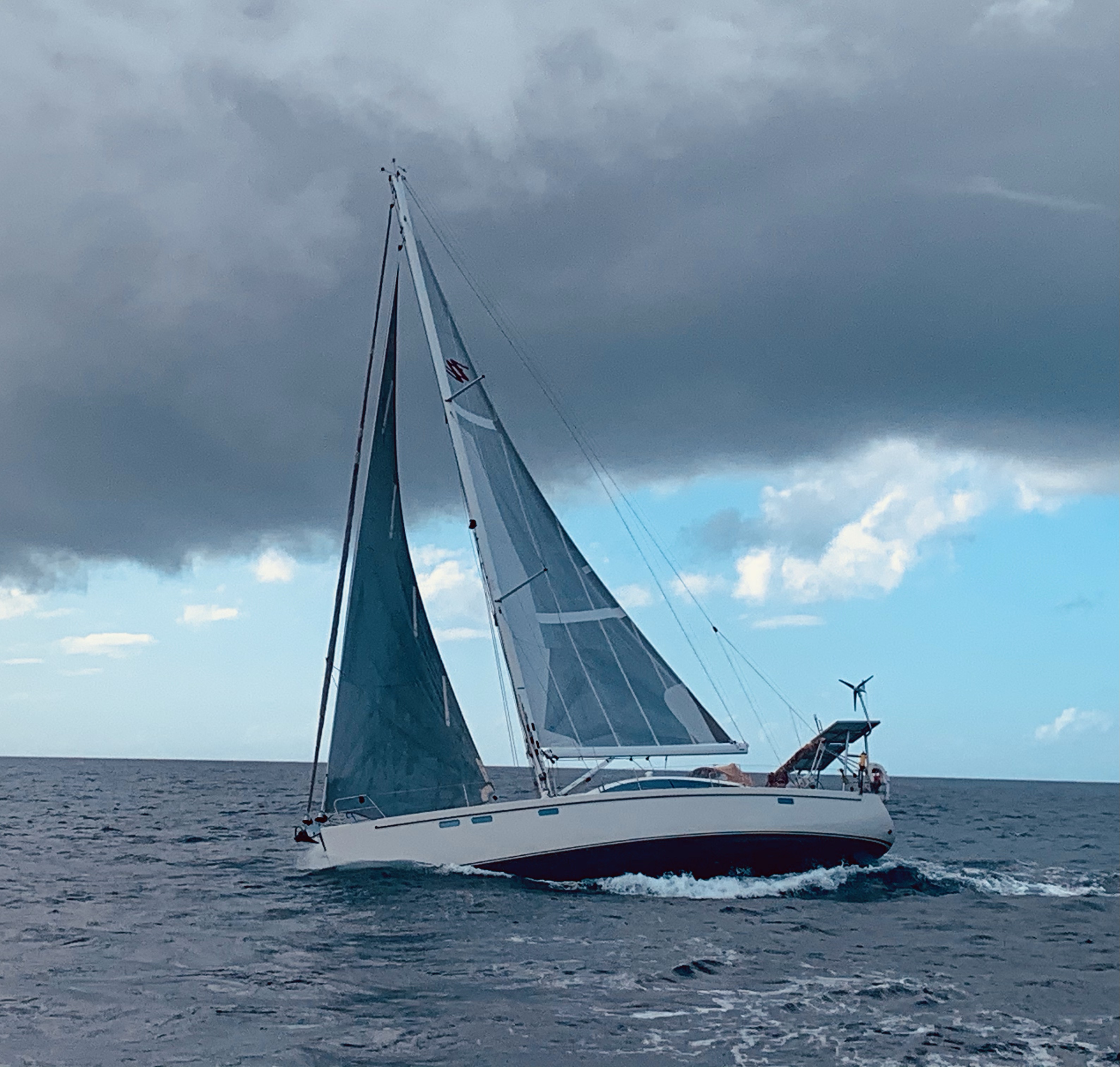 We’d put our radar on and watched the flashing red. Red is rain. We were set to reef the genoa at twenty. Then wait for the rain to turn out of the storm at thirty.