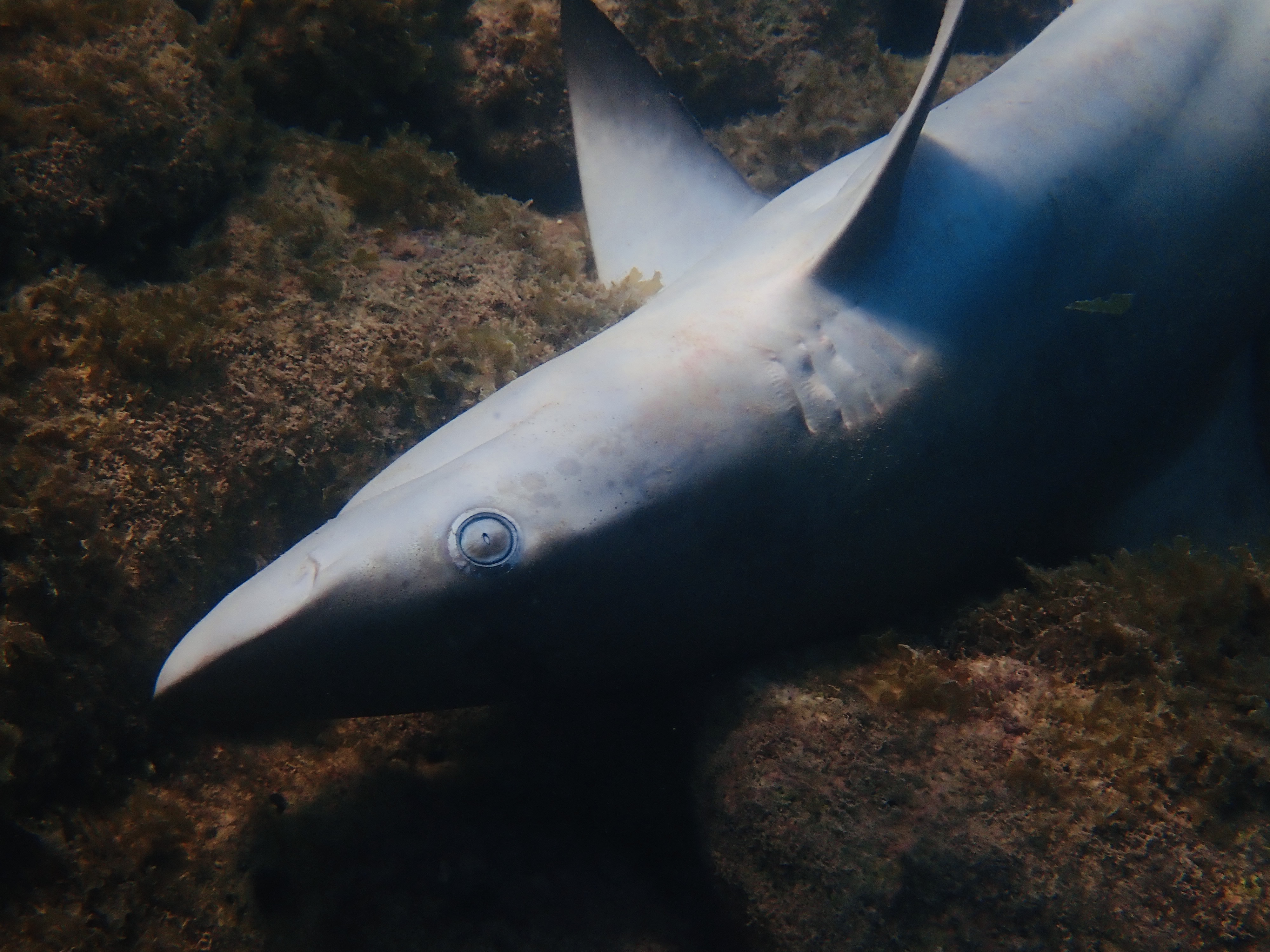 Once we swam to the edge of the channel to begin our descent, it was no longer scary. We did see a little dead shark, very white, on the shallow rock bed. No obvious sign of its demise. Poor sharkey. We didn’t see any living sharks. Not because they weren’t there.