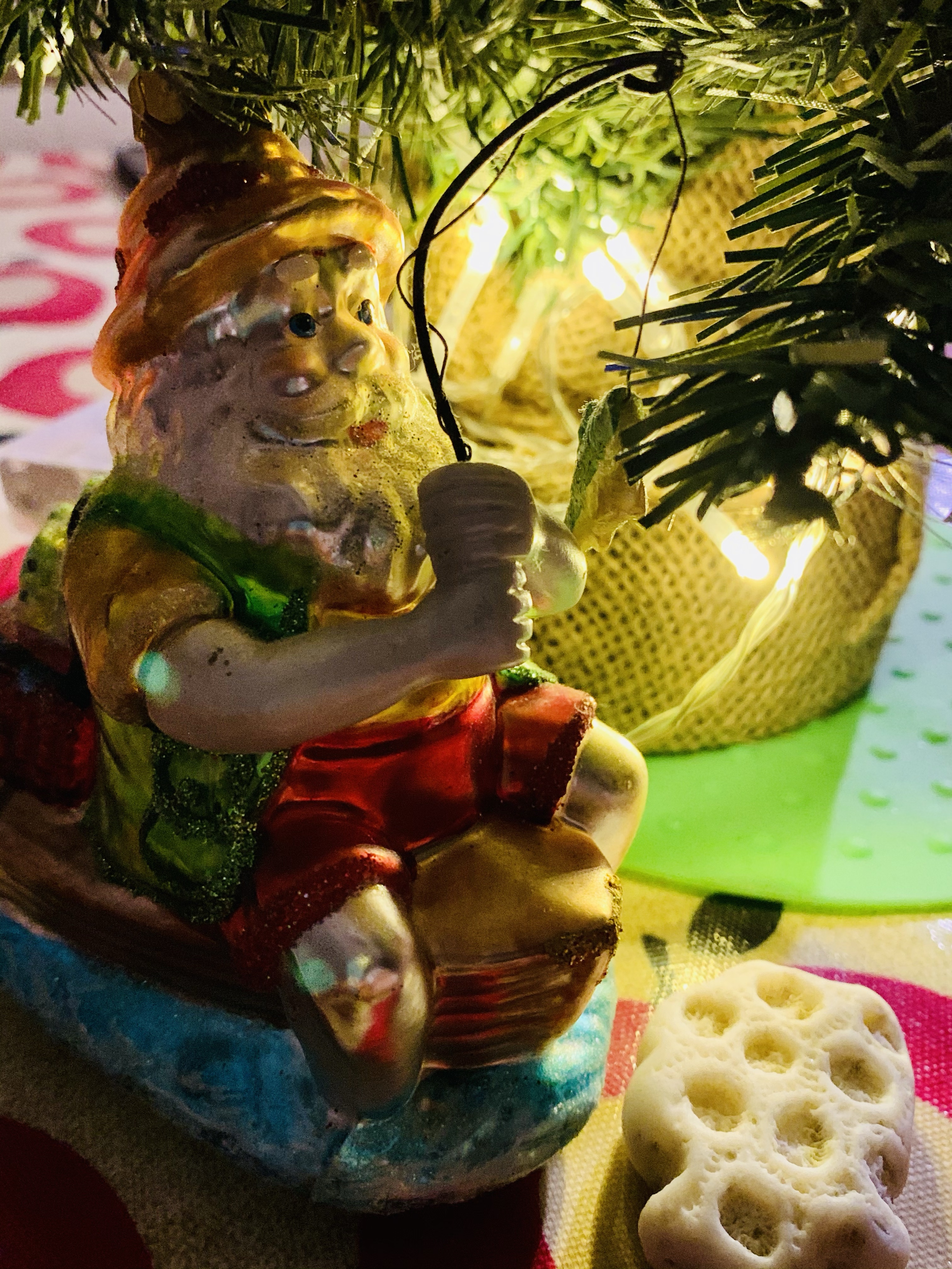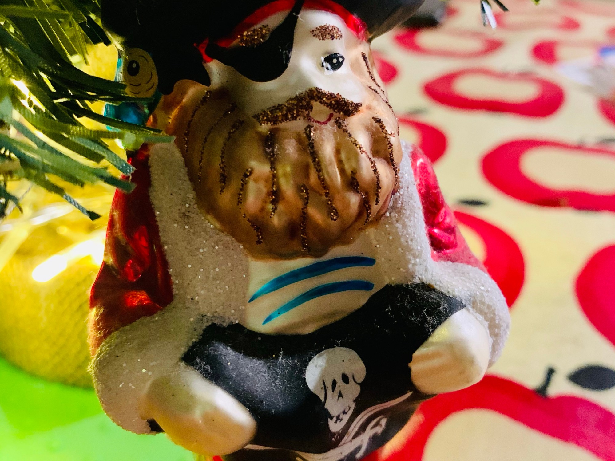 So now, two days before Christmas, the decorations came out. The pirate and fishing Santa were both present. We released them from the window blind poppers.